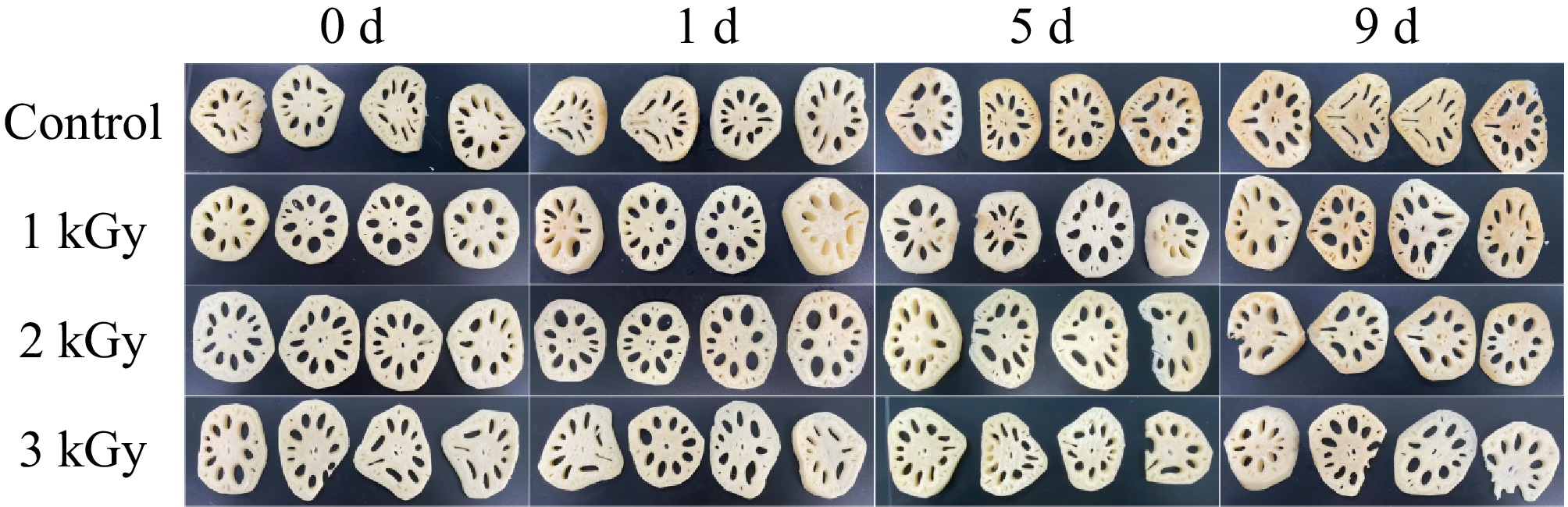 Pictures of fresh-cut lotus root subjected to 60Co-γ irradiation at 1, 2, and 3 kGy during storage.