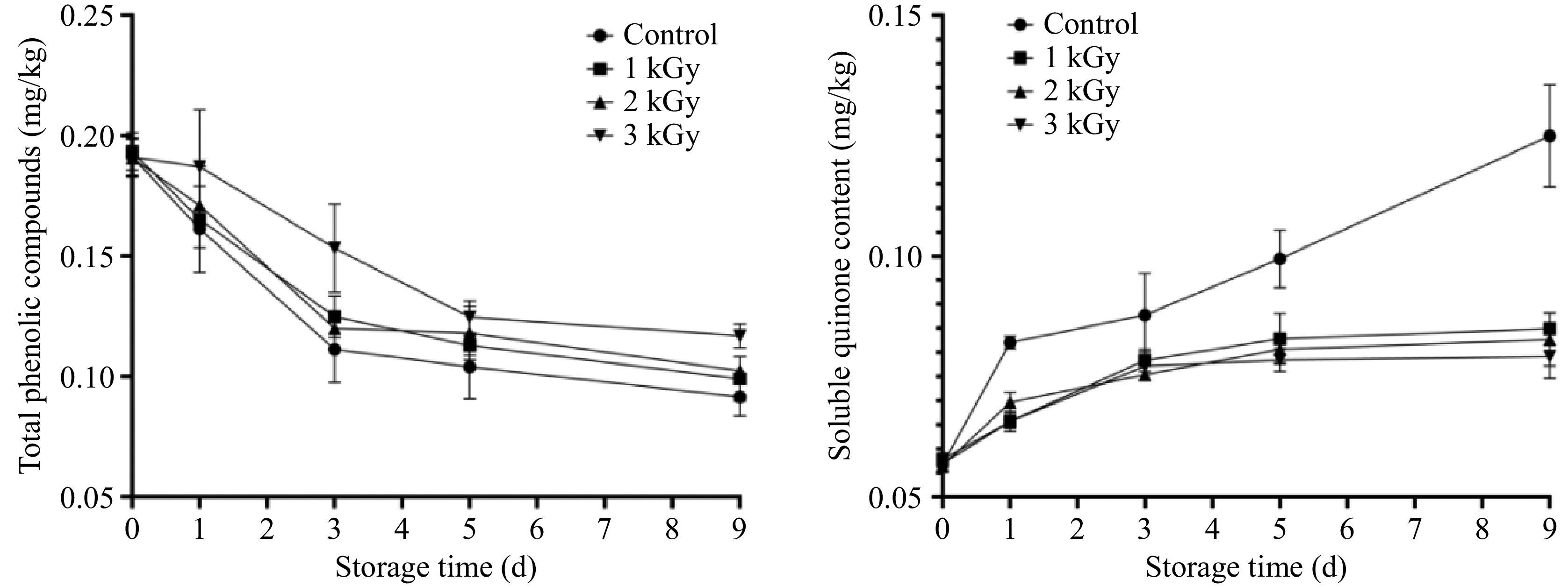 The dynamic changes of total phenolic compounds, and soluble quinone content of lotus root slices subjected to irradiation during storage.