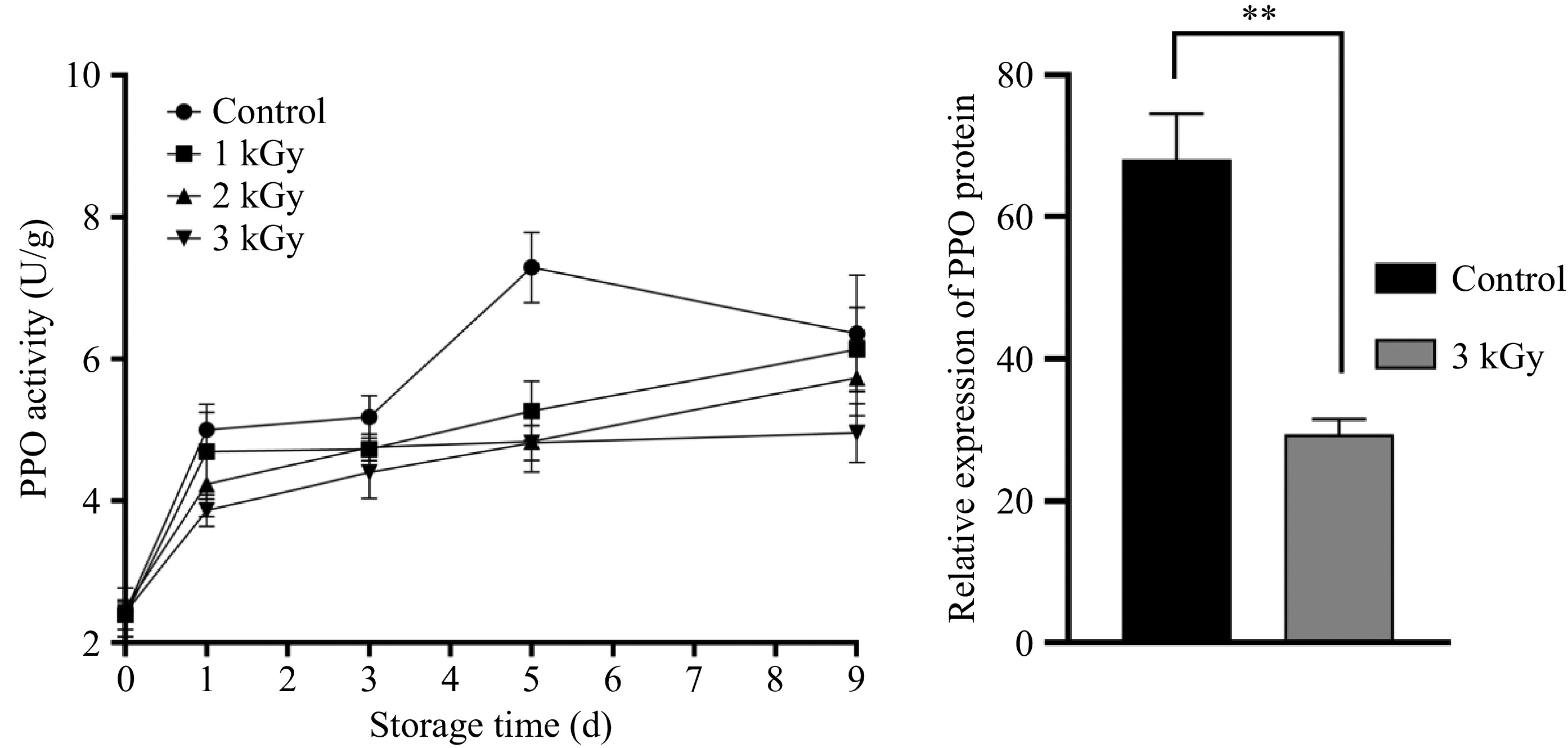 The PPO activity, and relative gene expression of PPO of lotus root slice samples with and without irradiation. ** Represents significant different between treatments (p < 0.05).