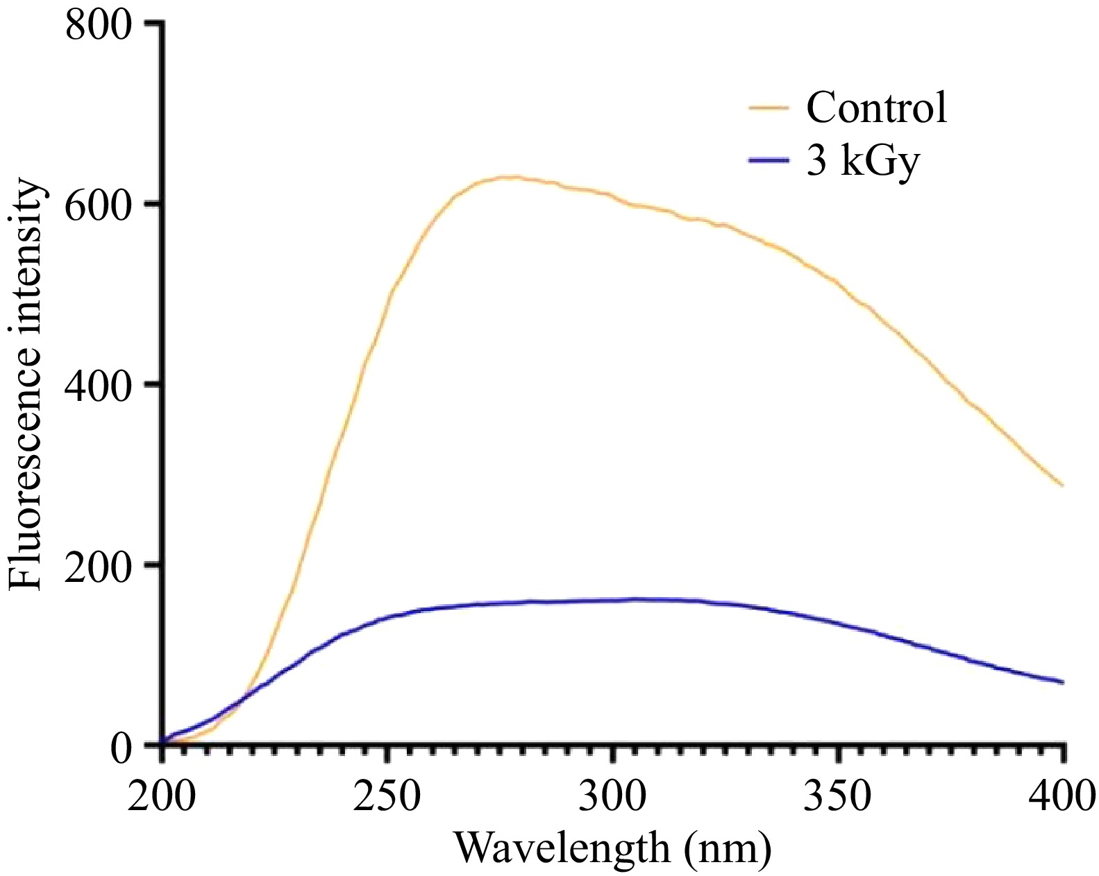 Tertiary structural changes in PPO induced by gamma irradiation were assessed by intrinsic fluorescence spectroscopy (Fig. 5). Compared to the native PPO, irradiation treatment caused a marked decrease in fluorescence intensity. Furthermore, a clear redshift in the maximum emission wavelength was observed. For the 3 kGy treatment group, the emission maximum shifted from 275 to 310 nm (Fig. 5). This spectral change signifies a fundamental alteration in the enzyme's conformation. The concurrent redshift in emission maximum and decrease in fluorescence intensity (Fig. 5) confirmed that gamma irradiation induced microenvironmental alterations around aromatic residues, leading to the disruption of PPO's native tertiary structure.