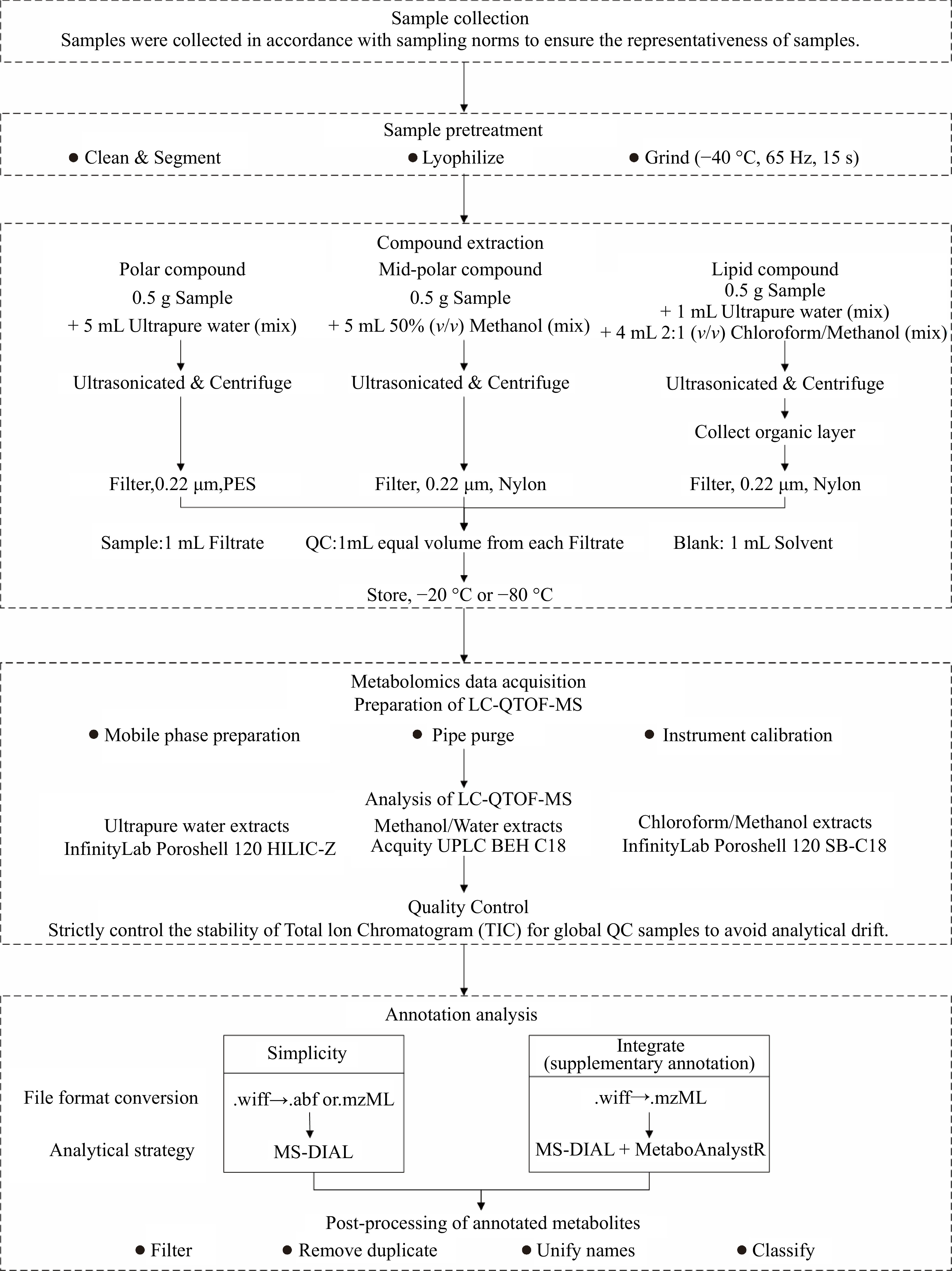 Clean the fruit and vegetable samples, and keep the edible part. After that, cut the solid samples into slices or small pieces. And the semi-solid samples are mixed and placed on the sterile plates. For fruits and vegetables with high water content or cloudy juice/pulp samples, priority can be given to lyophilization before compound extraction to improve the feature intensity of subsequent detection. The samples should be frozen with liquid nitrogen to make sure the moisture forms ice crystals, which can sublimate during the lyophilization process. Lyophilize the frozen samples to a crisp state with a vacuum freeze dryer. For the vacuum freeze dryer with heating function, the plate temperature should not be set too high to avoid thermal degradation of metabolites; generally, less than 10 °C is appropriate. Grind the lyophilized sample into a fine powder with a freeze grinder, then collect and store the powder at −80 °C. Specifically, juice samples are not allowed to be lyophilized.