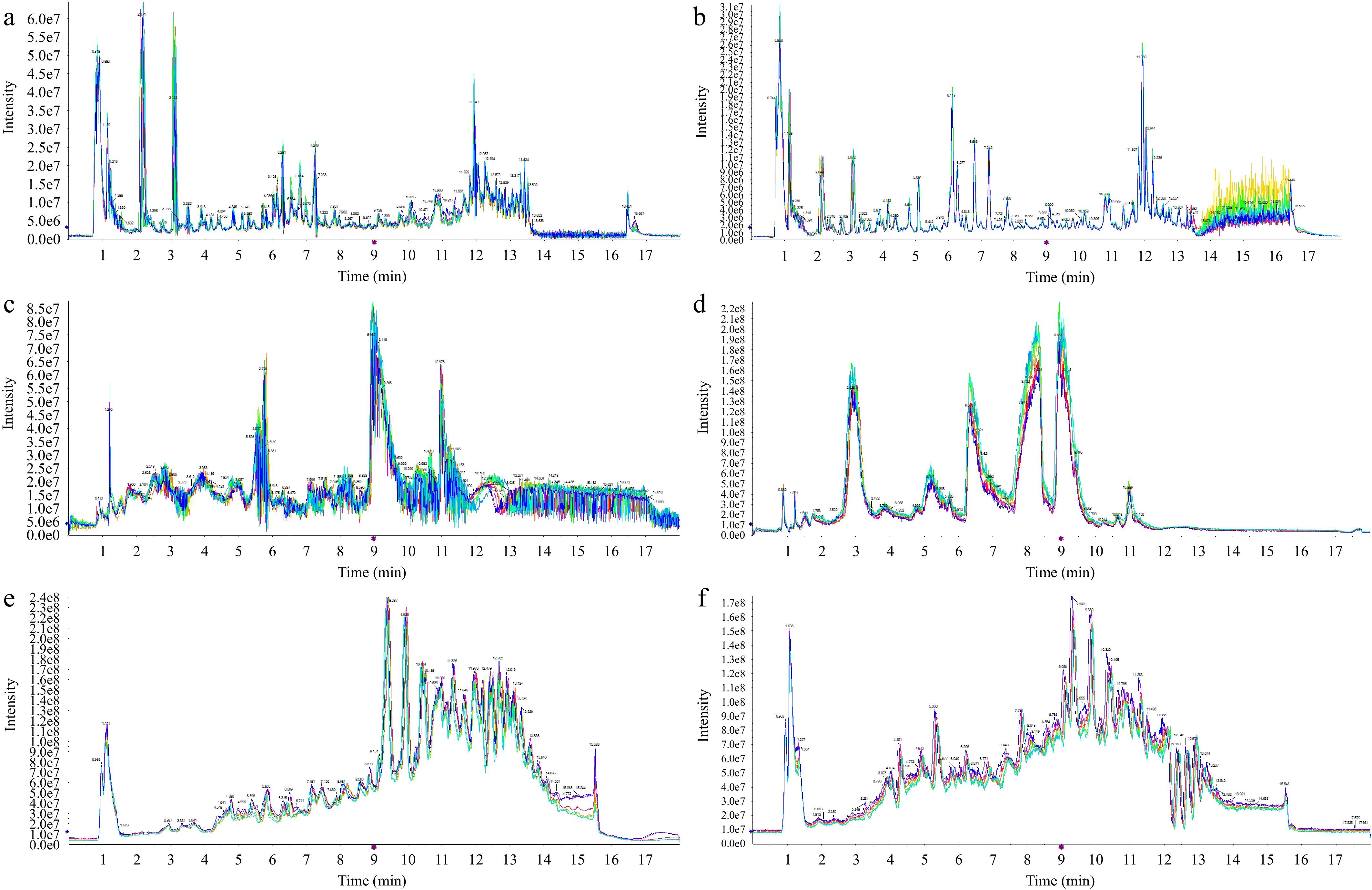 TIC plot of QC samples. (a) Methanol-C18 group, acquired in positive ion mode. (b) Methanol-C18 group, acquired in negative ion mode. (c) Water-HILIC group, acquired in positive ion mode. (d) Water-HILIC group, acquired in negative ion mode. (e) Lipid-C18 group, acquired in positive ion mode. (f) Lipid-C18 group, acquired in negative ion mode.