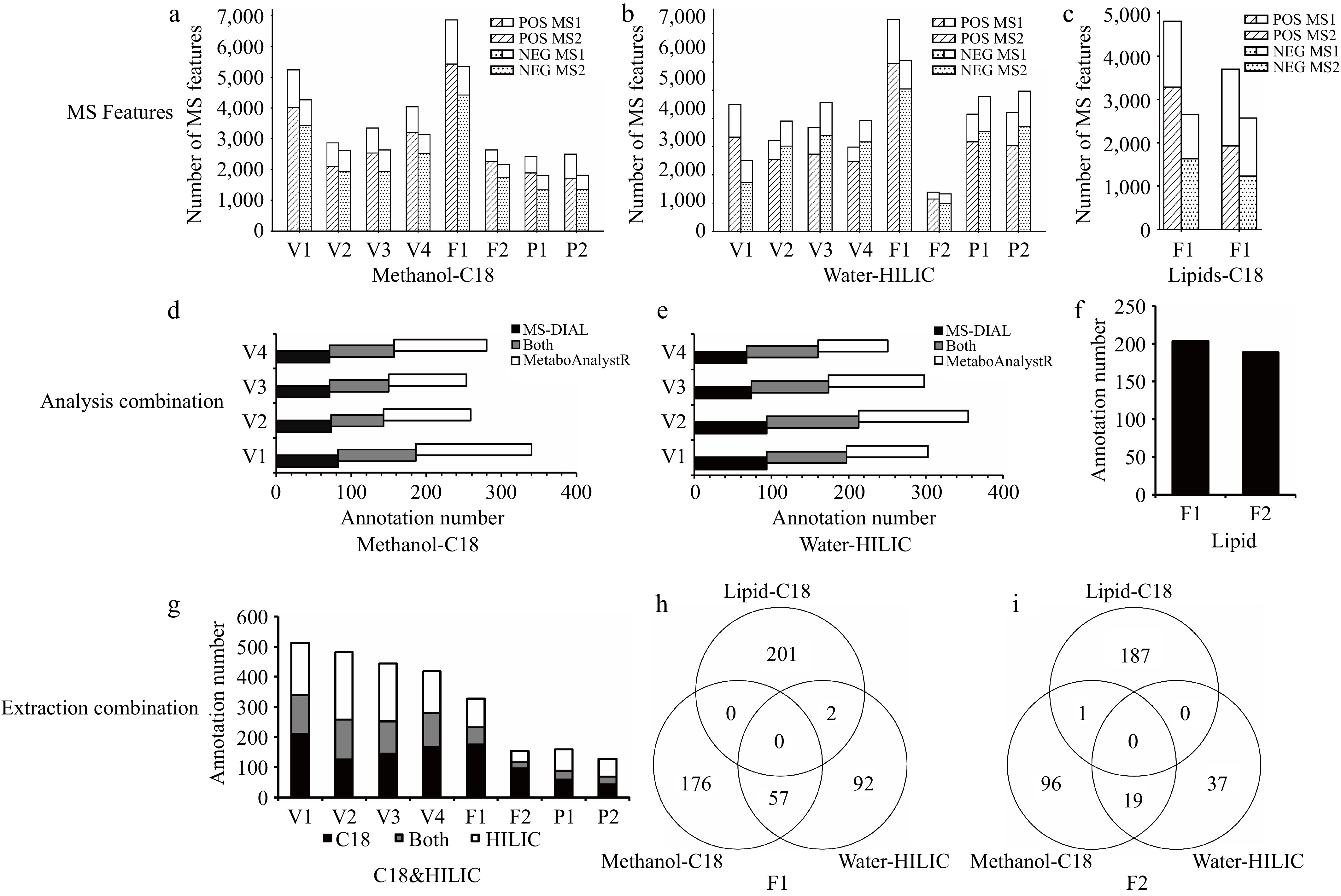 Strategy evaluation results. MS features of all samples in positive (POS) and negative (NEG) ion modes: (a) Methanol-C18 group, (b) Water-HILIC group, and (c) Lipid-C18 group. Combination of annotation results from different analysis tools (merge positive and negative ion modes) (d) Combination of annotation results from MS-DIAL and MetaboAnalystR in the Methanol-C18 group, (e) combination of annotation results from MS-DIAL and MetaboAnalystR in the Water-HILIC group, and (f) annotation results from MS-DIAL (lipidomics module) in the Lipid-C18 group. Combination of annotation results from different extraction groups: (g) combination of annotation results from Methanol-C18 group and Water-HILIC group, (h), (i) Venn plots of annotated metabolites extracted by three methods for two types of fruit.