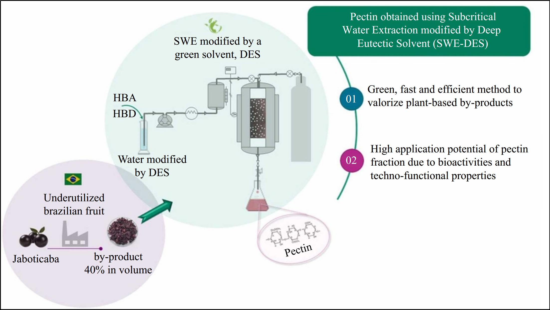 TPC: (14.65–42.00 gGAE/g), and AOA: (1.93–3.20 MTE/g)[71] Figure 3 demonstrates the extraction of pectin from jaboticaba by-products using the subcritical water extraction modified with deep eutectic solvent (SWE-DES). The operational parameters were optimized using response surface methods, resulting in 122 °C, 8% DES, and a flow rate of 2 mL/min. SWE yields are 1.5 to 1.8 times greater than those from standard extraction methods. When SWE-DES was used and increased the yield of pectin, the galic acid content, antioxidant capacity, and stability of the emulsion were all higher than in the control group[72].