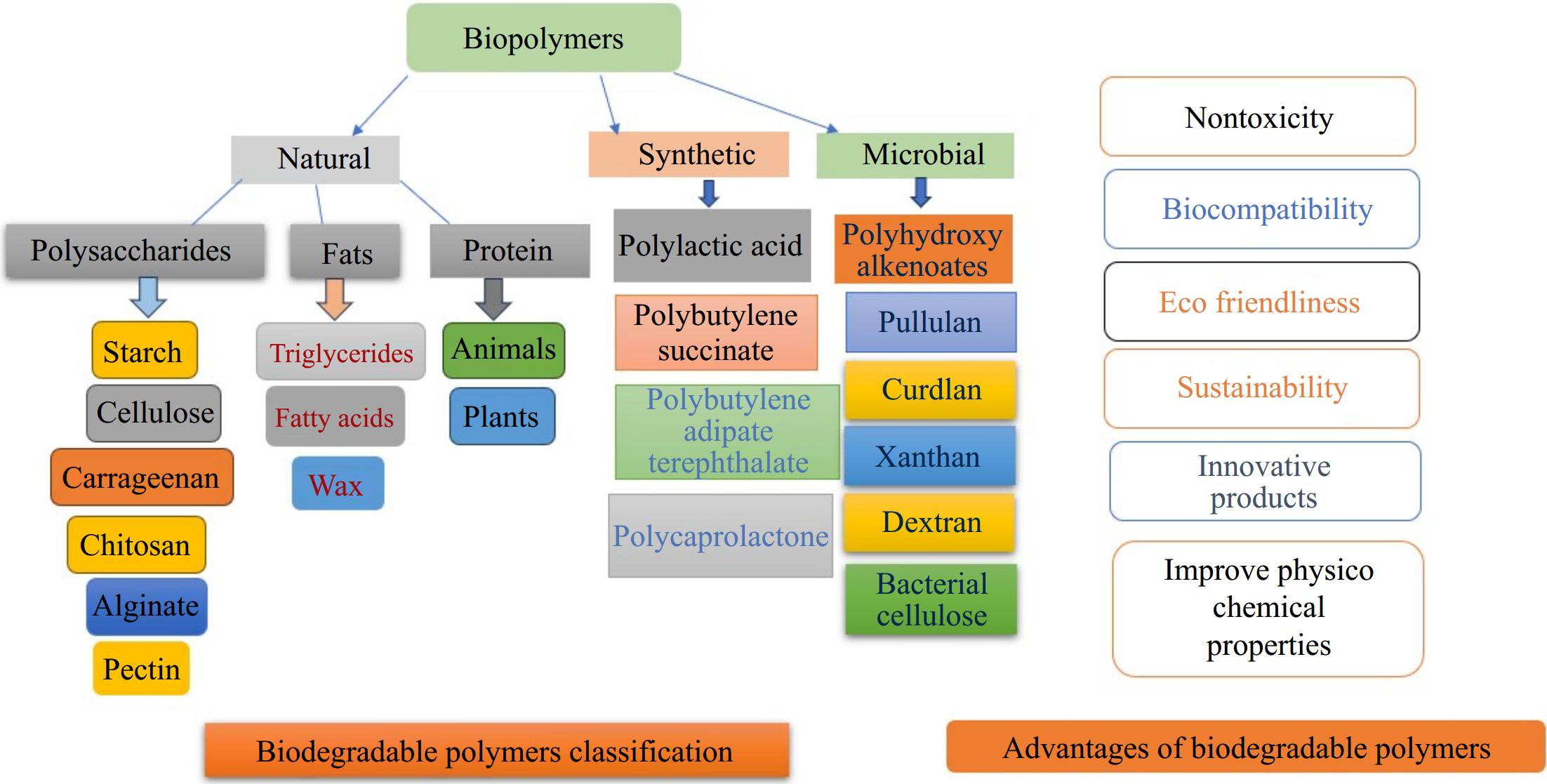 The selection of suitable materials is essential for producing eco-friendly, biodegradable films, and coatings. The best biomaterials including polysaccharides, starch, pectin, chitosan, cellulose, and alginates, biodegradable proteins, such as gelatin, casein, gluten[73], lipids, oils, and waxes enhance the effectiveness of packaging materials[74]. Sustainable alternatives to nondegradable packaging materials have emerged as biodegradable packaging materials derived from biopolymers, attracting significant concentration[75]. The classification of polymers is determined by their origin from natural, synthetic, and microbial fermentation have some advantages, which are also listed in Fig. 4[76,77].