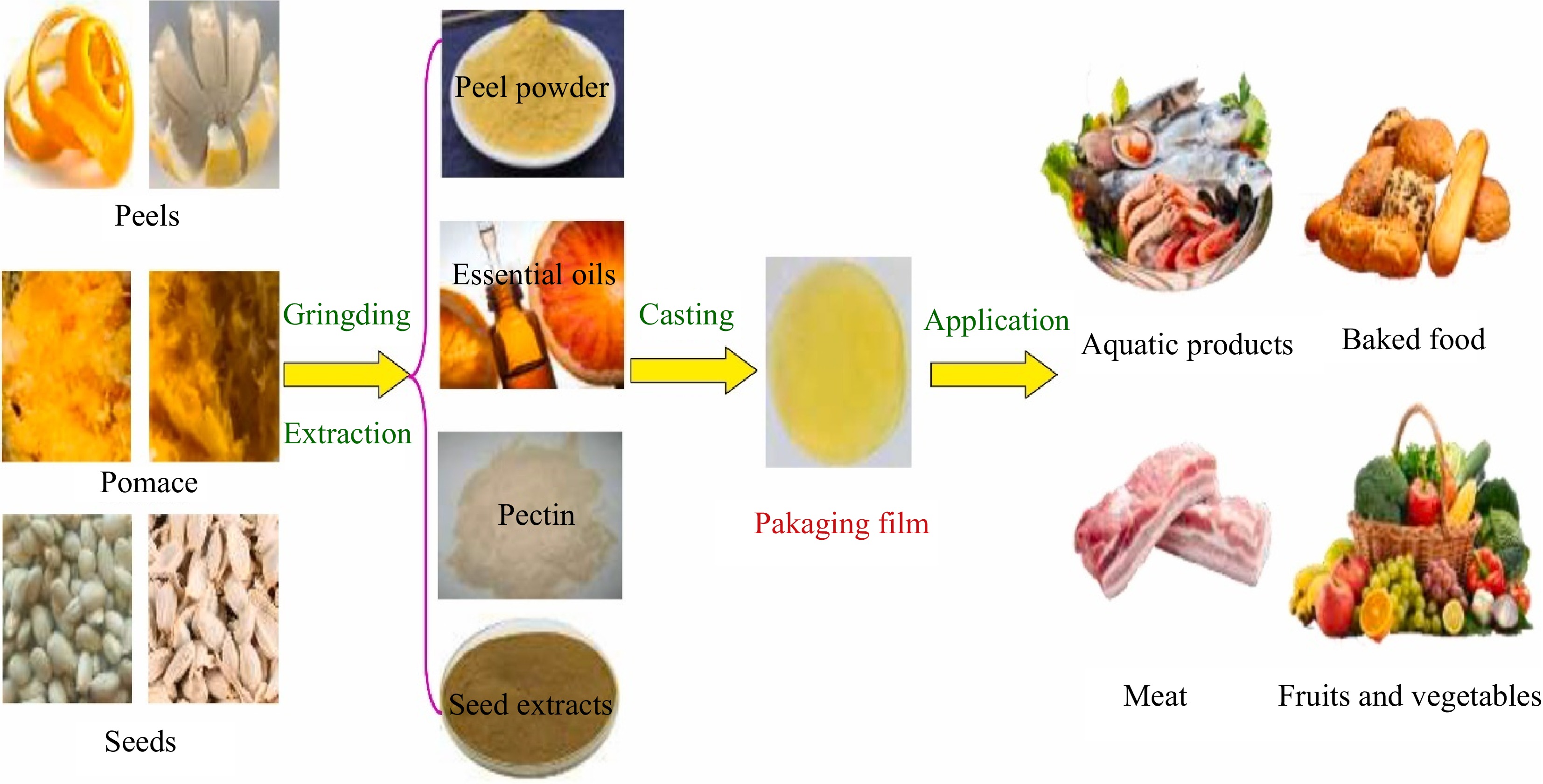 Citrus peels/pomace rich in pectin and used as food packaging films[90].