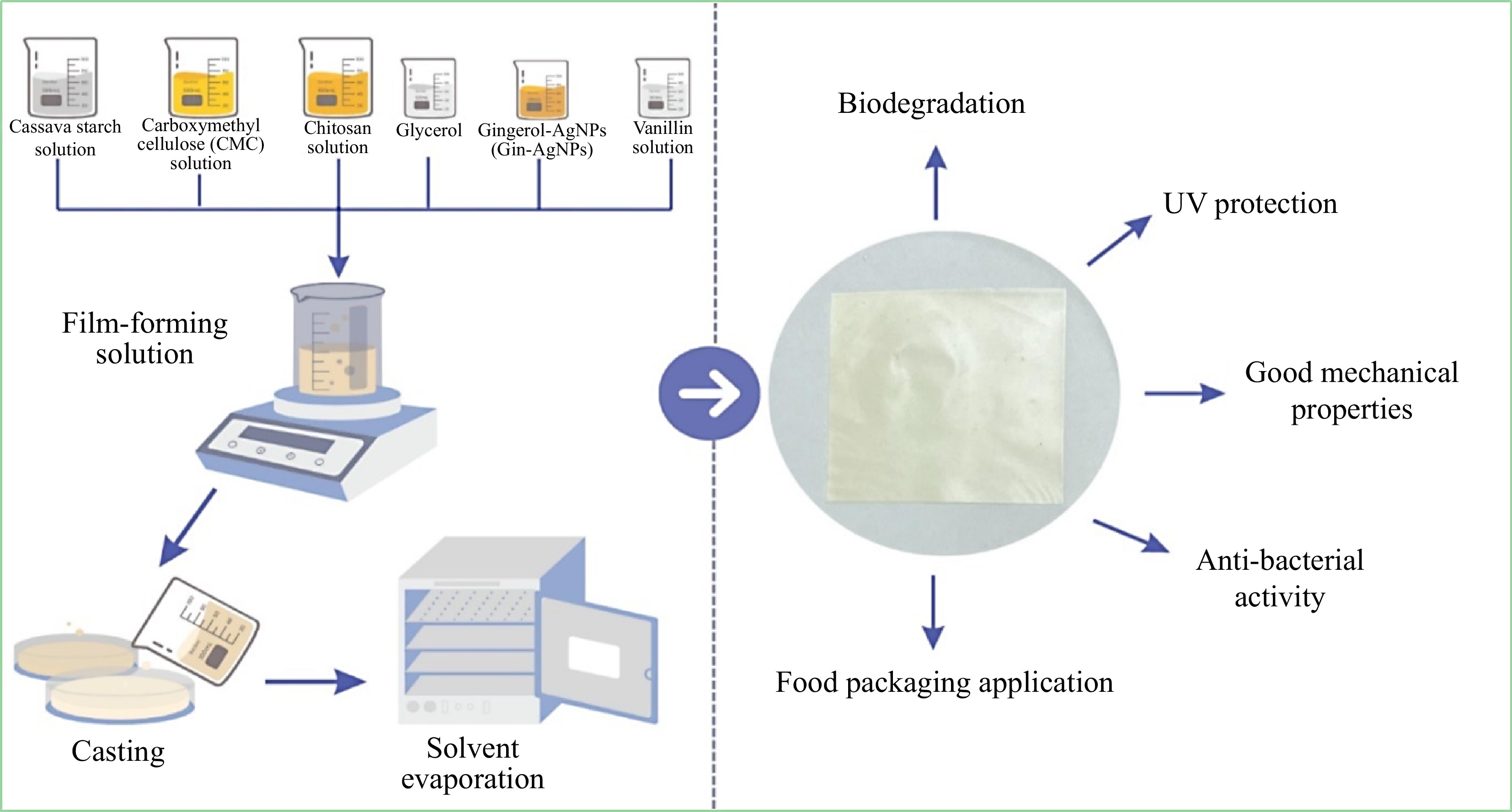 For developing packaging films (Fig. 8) using a combination of cassava starch (CV), chitosan (CT), and carboxymethyl cellulose (CMC), incorporating glycerol as a plasticizer. Among the various formulations tested, CT/CV/V/CMC/Gin-AgNPs1 stood out, displaying superior mechanical characteristics. This film also demonstrated significant antibacterial properties against both S. aureus and E. coli bacteria. Furthermore, it demonstrated excellent biodegradability, with over 50% weight loss after 21 d of soil burial. Additionally, the film effectively preserved the grapes at 4 °C for 21 d[126].