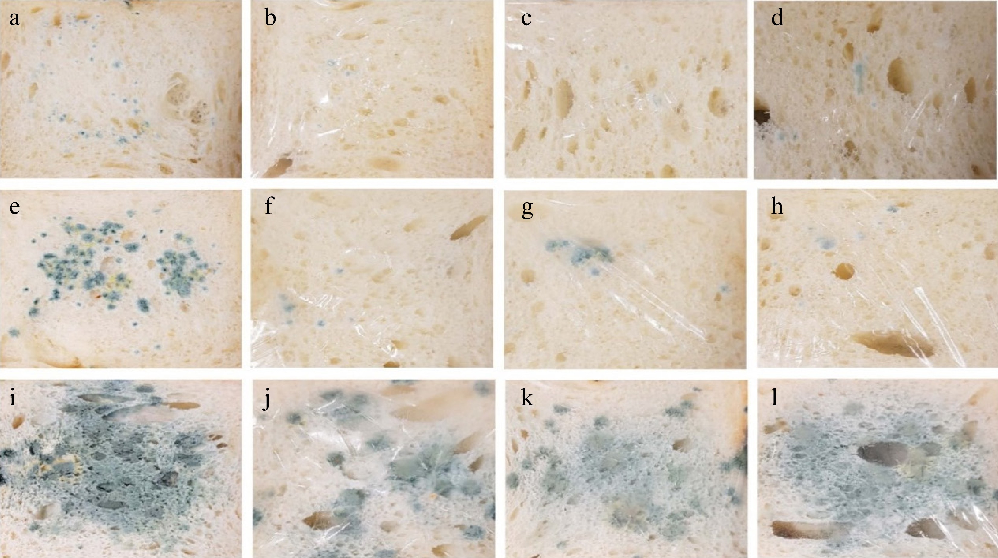 Growth of fungi in wheat bread: (a), (e), (i) control (unpacked); (b), (f), (j) with 2% film; (c), (g), (k) covered with DES-10% film; (d), (h), (l) with MO-10% film. (a)–(d) 6 d, (e)–(h) 7 d, (i)–(l) 11 d[36].