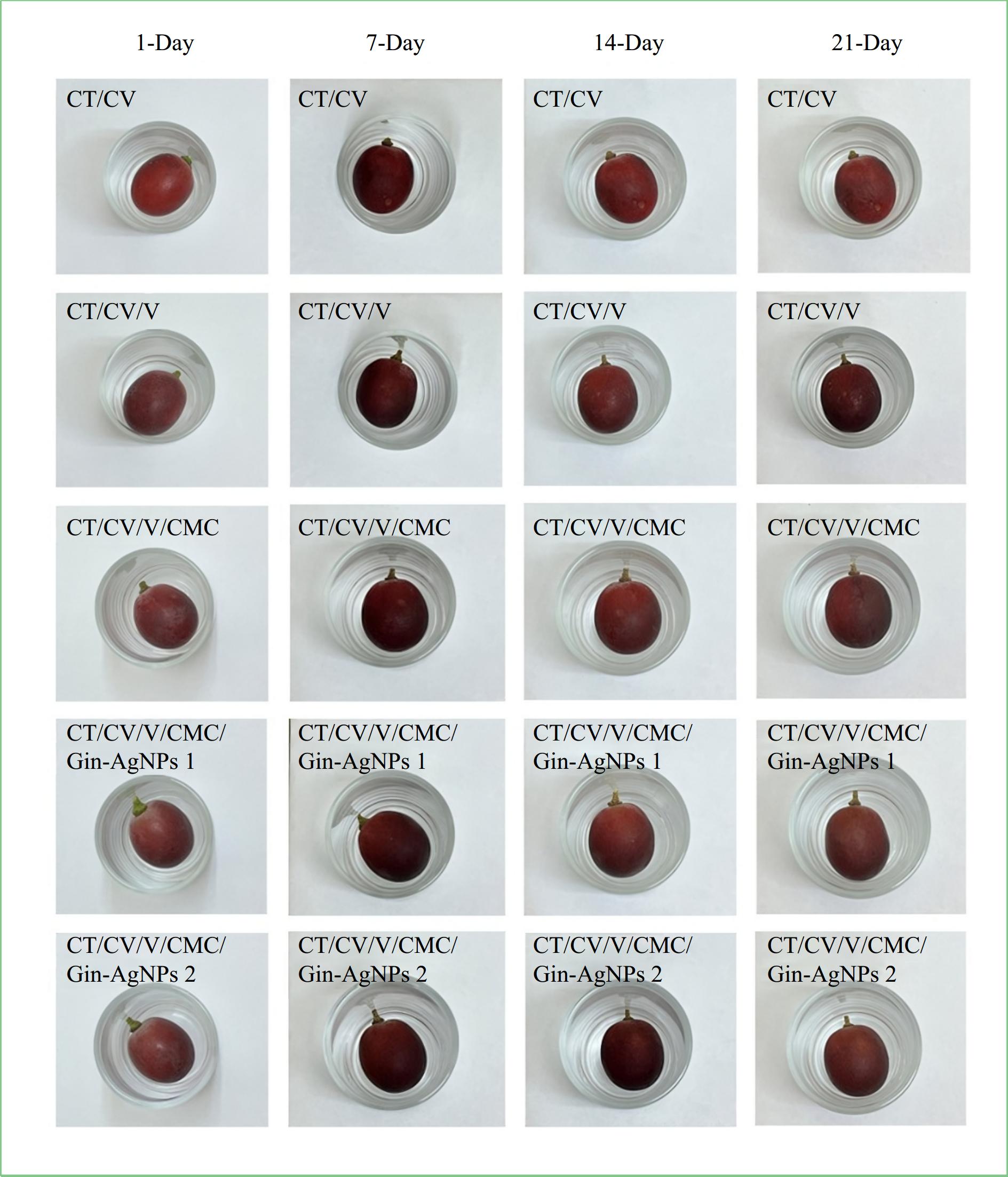 Preserved grapes with CT/CV, CT/CV/V, CT/CV/V/CMC, CT/C V/V/CMC/Gin-AgNPs 1, and CT/CV/V/CMC/Gin-AgNPs 2 films for 1, 7, 14, and 21 d[126].