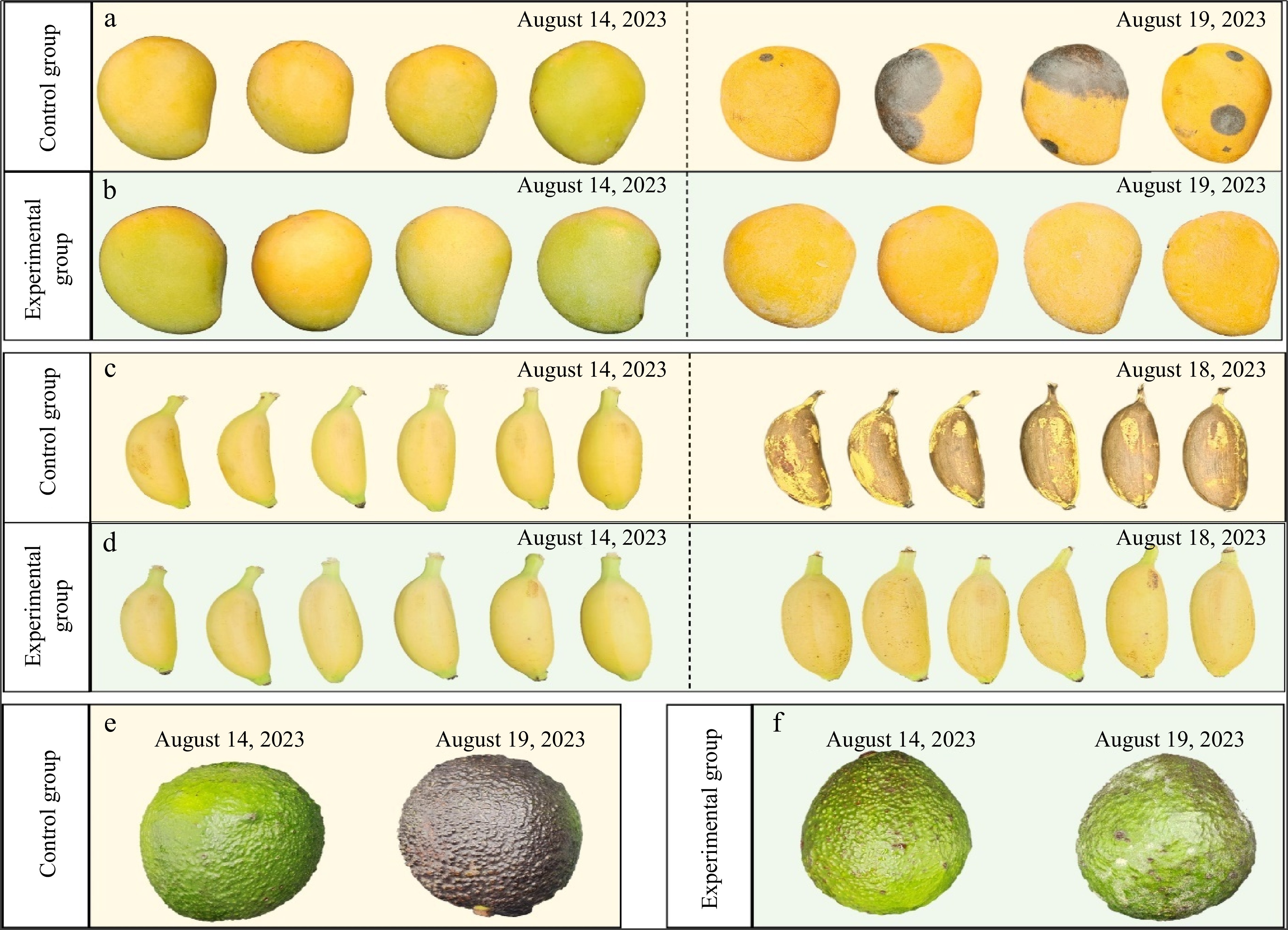 Biodegradable antimicrobial bioplastics for food packaging solutions to address environmental pollution and food safety issues associated with petrochemical plastics and food spoilage. Figure 9 demonstrates that naturally active bioplastic derived from citrus peel biomass can be used for preserving perishable fruits. These innovative plastics are observed by their nanoscale structure, which features linked and recombined hydrogen bonds among pectin, polyphenols, and cellulose micro/nanofibrils. The resulting material has good flexibility, tensile strength, gas barrier properties, and antimicrobial capabilities. After application in food packaging, these bioplastics effectively extend the shelf life of perishable fruits such as bananas and mangoes[115].