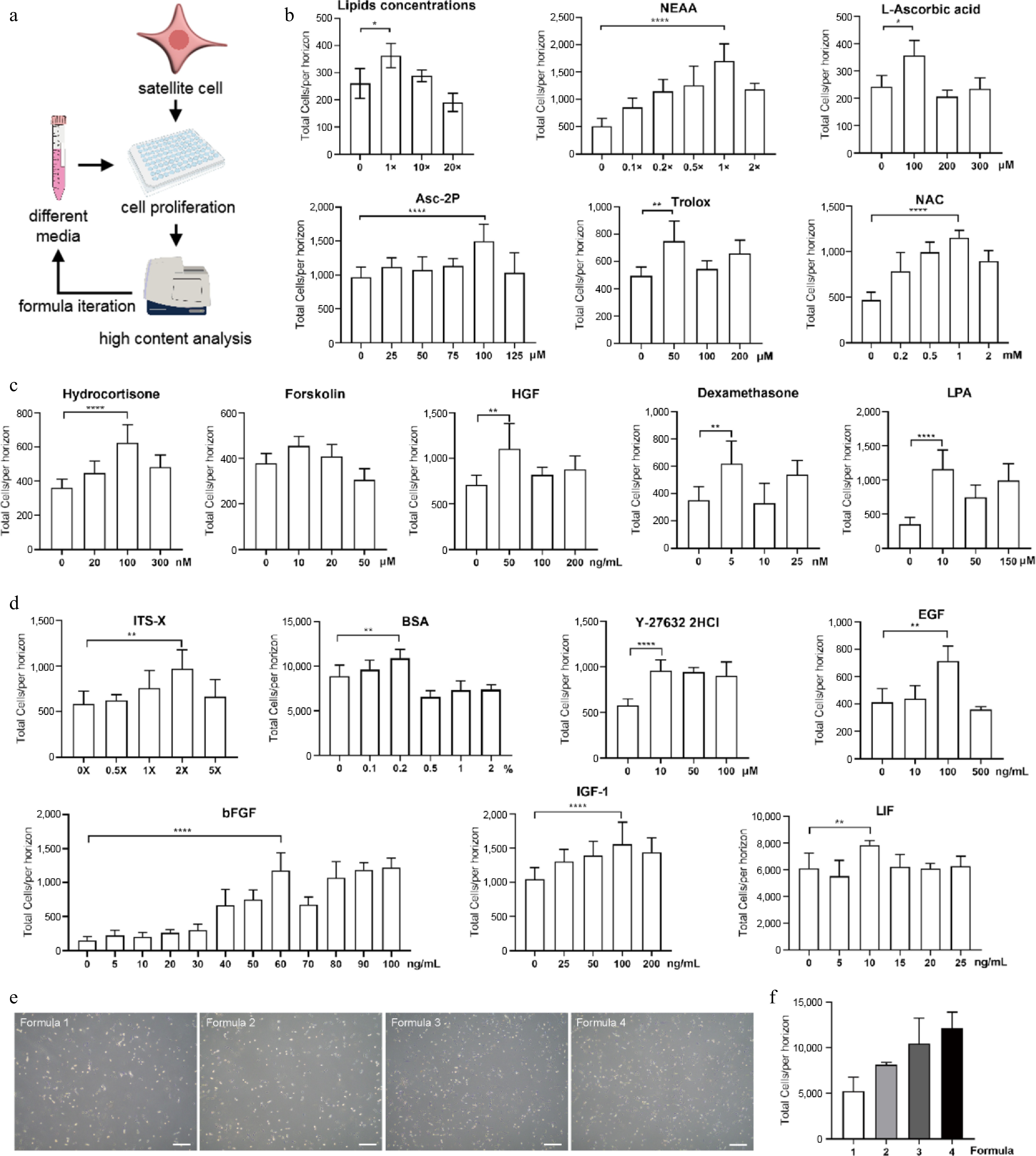 Construction of serum-free proliferation medium for porcine SCs. (a) Schematic overview of medium formula iteration. (b) Effects of different supplements on cell growth with varied concentrations in Formula 2. (c) Effects of different factors on cell growth with varied concentrations in Formula 3. (d) Optimization of concentrations of factors used in Formula 1 to yield Formula 4. (e) Bright-field images of SCs cultivated by different media at day 3. Scale bars, 500 μm. (f) The effect on cell growth of different media. Mean ± SD from at least three independent experiments. Significance was analyzed by one-way ANOVA. * p < 0.05, ** p < 0.01, *** p < 0.001, **** p < 0.0001, ns, not significant (p > 0.05).