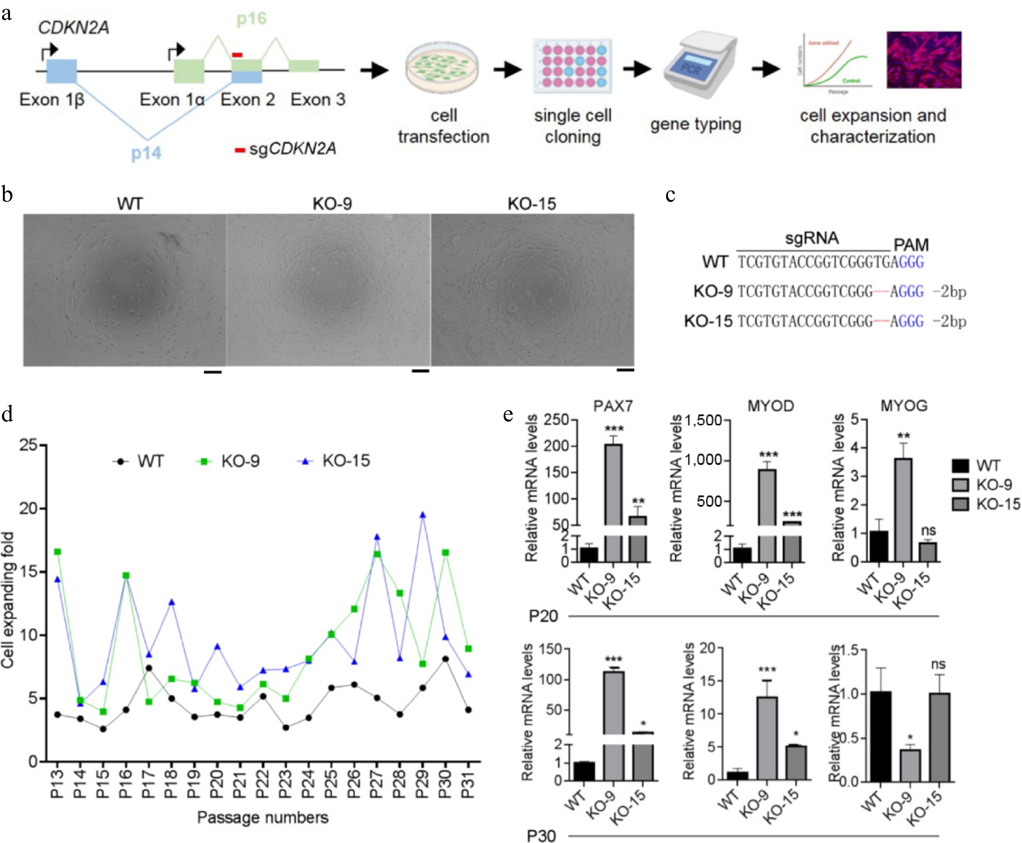 • As the expression of myogenic factors failed to maintain in serum-free A19-cultivated primary SCs (Fig. 2bd), we next attempted to modify SCs through targeted genomic engineering approaches. We selected the CDKN2A gene locus as the target, which encodes p16INK4A and p14ARF, two factors known to drive cell cycle arrest and cellular senescence[33,34]. To knock out CDKN2A in porcine SCs, we designed single guide RNAs (sgCDKN2A) for Cas9 targeting exon 2 of CDKN2A gene, which provides genetic information for both p16INK4A and p14ARF (Fig. 3a). SCs were transduced with vectors expressing Cas/sgCDKN2A, and knockout clones were screened via single cell cloning and gene typing methods (Fig. 3a). Two CDKN2A−/− SC clones, KO-9 (−2 bp) and KO-15 (-2 bp) were successfully selected (Fig. 3b, c). We then cultured CDKN2A+/+ (WT) and CDKN2A−/− (KO) SCs for long-term periods. As shown in Fig. 3d, the proliferation rate of KO-9 and KO-15 SCs was significantly higher than that of WT cells during at least 18 passages. Moreover, expression level of PAX7 was significantly upregulated to ~194 folds in KO-9 SCs and ~52 folds in KO-15 SCs at passage 20 (P20) when compared to WT controls (Fig. 3e). Consistent results were observed at P30 (Fig. 3e). CDKN2A depletion also improved the expression of MYOD in two CDKN2A−/− clones at both P20 and P30 (Fig. 3e). MYOG mRNA level in KO-9 SCs was significantly up-regulated at P20 while downregulated at P30 compared with WT cells (Fig. 3e). Nonetheless, expression of MYOG was comparable in WT and KO-15 SCs at both passages (Fig. 3e). These results suggest that CDKN2A depletion significantly promote the proliferation capacity and maintenance of myogenic factors in porcine SCs.