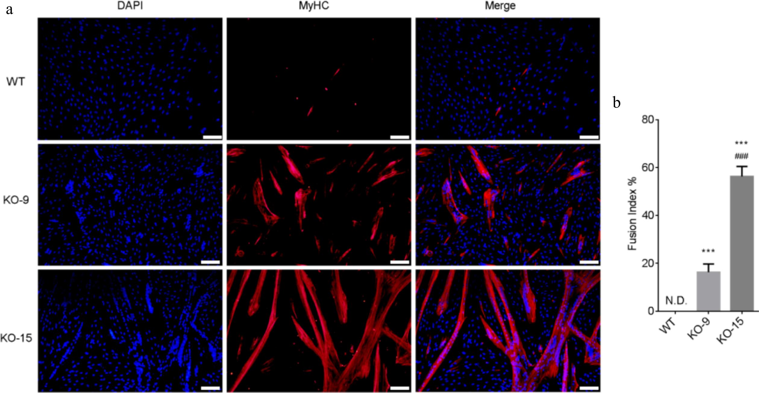 Differentiation capacity of CDKN2A−/− SCs under serum condition. (a) Immunofluorescence staining of MyHC (red) and nucleus (blue) in differentiated WT and KO cells. Scale bar, 100 μm. (b) The fusion index was calculated as the percentage of myotubes with more than three nuclei. Mean ± SD from three independent experiments. Significance was analyzed by one-way ANOVA. *** p < 0.001, compared with WT group. ### p <0.001, compared with KO-9 group.
