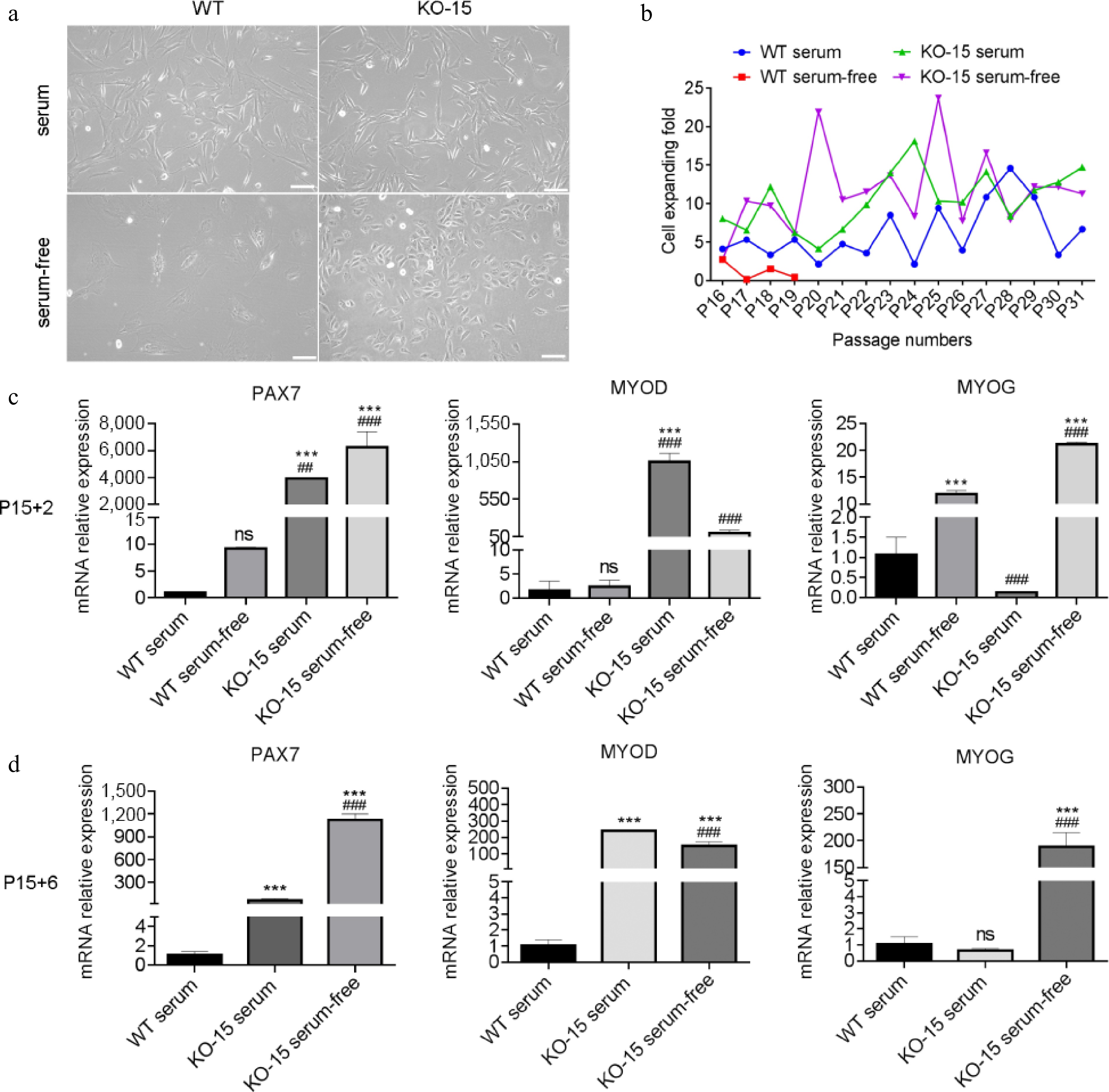 Characterization of CDKN2A−/− SCs in serum-free condition. (a) Microscopic images of WT and KO-15 SCs under bright field. Scale bar, 100 μm. (b) Cell expanding folds of SCs under serum and serum-free conditions. (c), (d) Expression by qPCR of PAX7, MYOD, and MYOG of SCs at P15 + 2 and P15 + 6. '+X' indicates the cultivated passages in serum-free condition. Mean ± SD from three independent experiments. Significance was analyzed by (c) two-way ANOVA, and (d) one-way ANOVA . *** p < 0.001, compared with WT group. ## p <0.01, ### p <0.001, compared with KO-9 group, ns, not significant (p > 0.05).