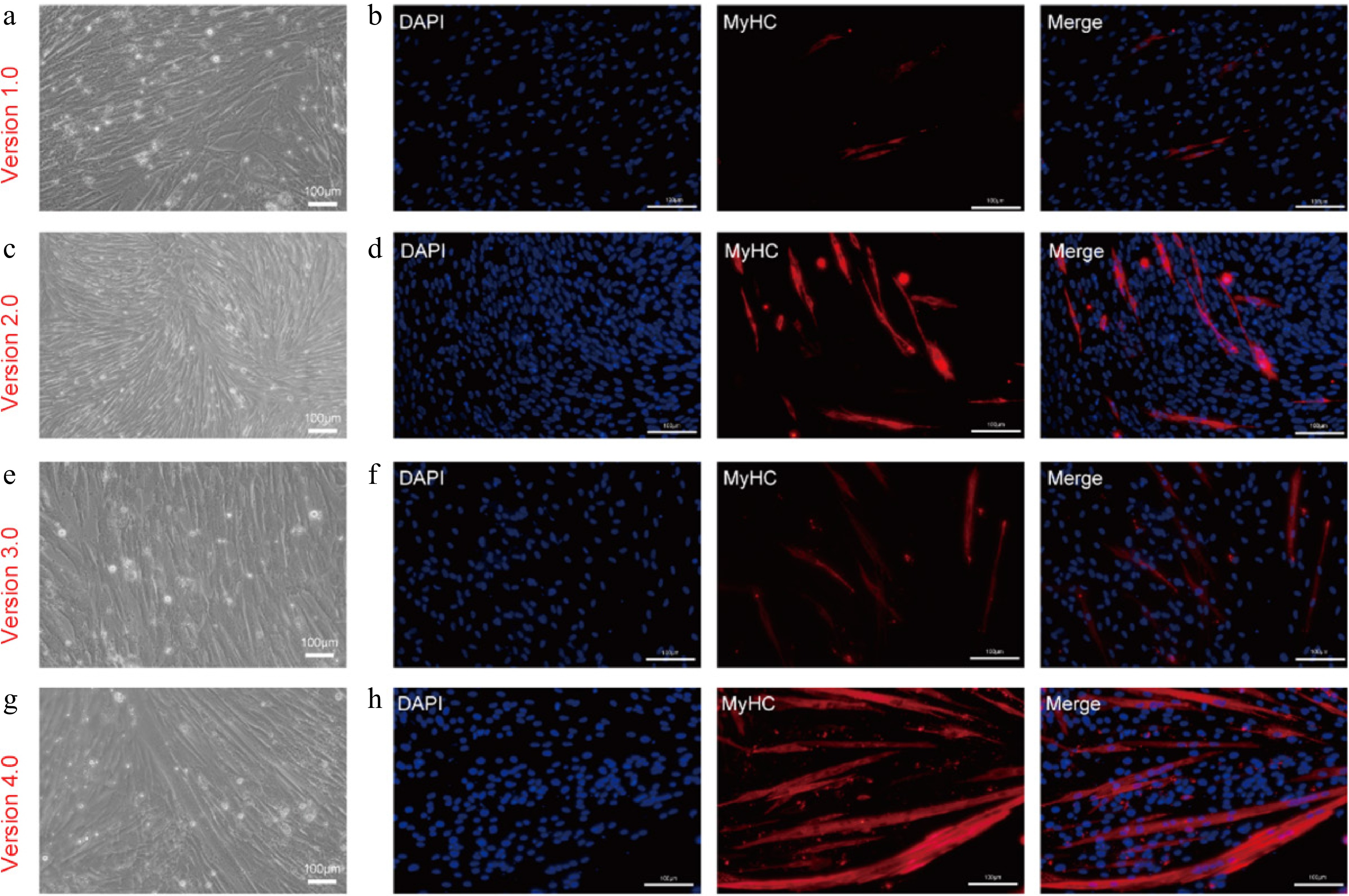 Myogenic differentiation of CDKN2A−/− SCs in serum-free condition. (a), (c), (e), (g) Bright-field images, and (b), (d), (f), (h) immunofluorescent staining of KO-15 MuSCs induced by different serum-free differentiation media at day 4: (a), (b) serum-free myogenic differentiation medium (Version 1.0). (c), (d) Serum-free adipogenic differentiation medium (Version 2.0). (e), (f) Modified serum-free myogenic differentiation medium with 10 ng/mL insulin (Version 3.0). (g), (h) Modified serum-free adipogenic differentiation medium without dexamethasone, 3-isobutyl-1-methylxanthine and rosiglitazone (Version 4.0). Scale bars, 100 μm.