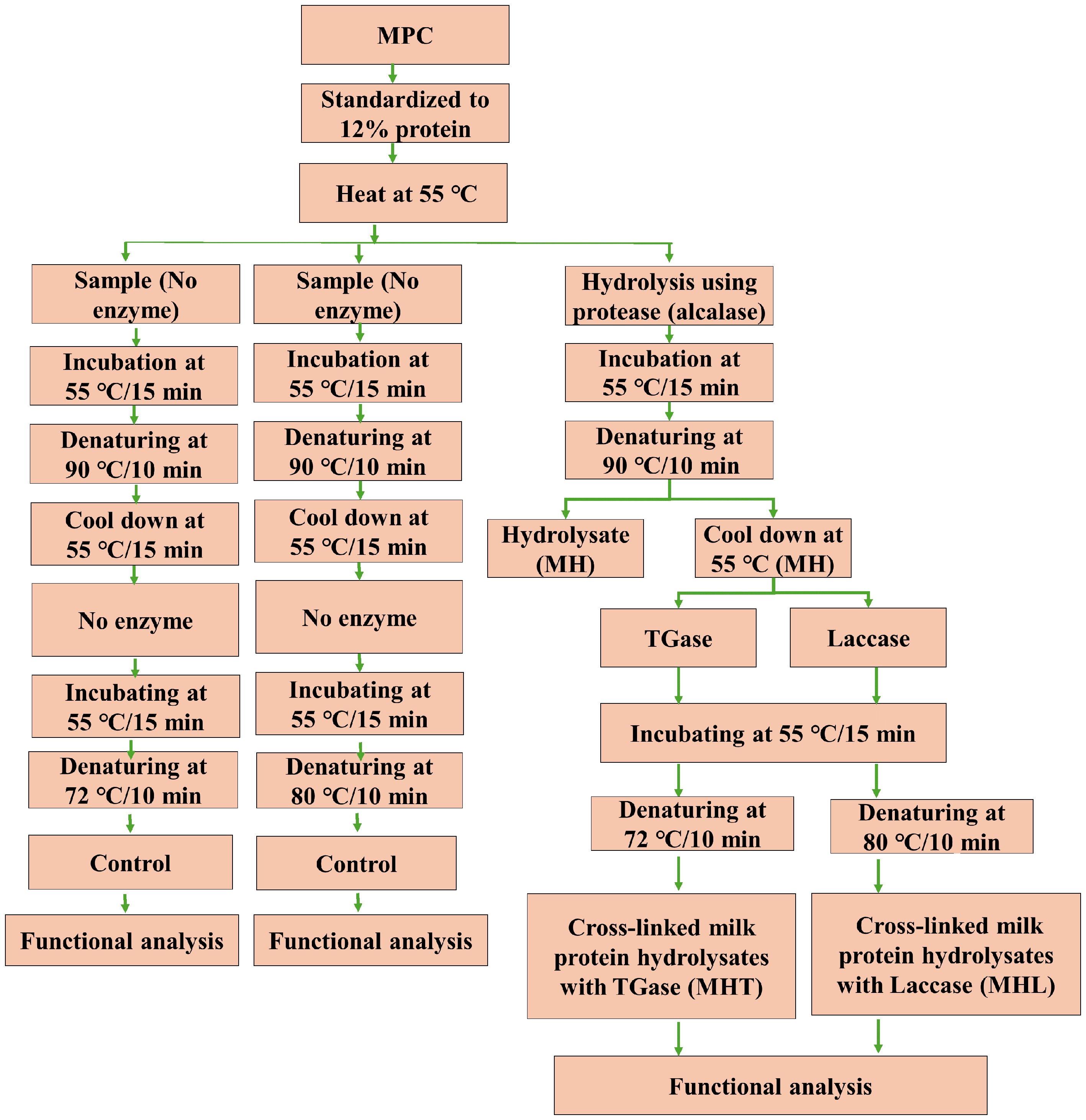 The design of the experiments is exhibited in Fig. 1. The protein content for each lot of MPC retentate was adjusted to 12% using distilled water. The 12% MPC solution was heated to 55 °C and divided into two parts. One part was control (with no enzyme addition). Another part was used for hydrolysis treatment. The alcalase enzyme was added at 4 µL/100 g protein at 55 °C and incubated for 15 min. The enzyme was then denatured by heating it at 90 °C for 10 min (MH). After hydrolysis treatment, denaturation, and sampling, the MH solution was divided into two lots. One lot of the hydrolyzed MPC was cross-linked with TGase (MHT), and another was cross-linked with laccase (MHL). Both the enzymes were used at a concentration of 2 U/g protein, incubated at 55 °C for 15 min. The MHT samples were denatured at 72 °C for 10 min, whereas the MHL samples were denatured at 80 °C for 10 min. After denaturation, the samples were cooled down and stored refrigerated until further use. The proximate composition and capillary gel electrophoresis (CGE) were carried out on the sample. The functional properties studied included physical characteristics (hydrodynamic diameter) and techno-functional characteristics (emulsion properties, heat stability, viscosity, foaming properties, and rheological characteristics). The control sample followed through similar steps but without enzymes.