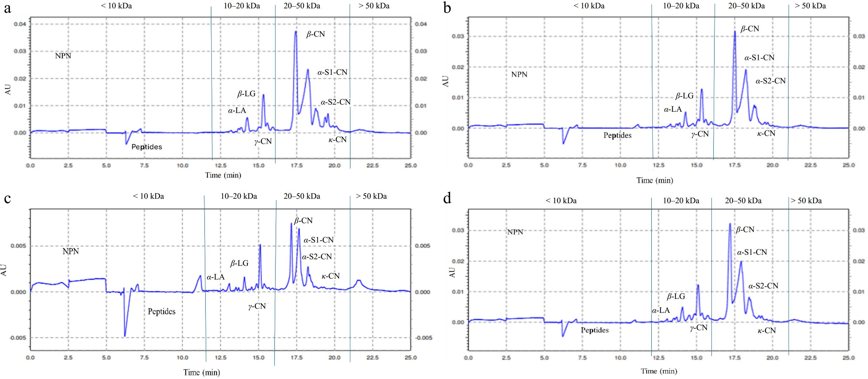 CGE is a method used for the quantitative study of protein aggregates and the qualitative measurements of molecular weight (MW). Typical electropherograms of MPC treated with enzymes are depicted in Fig. 2. The CGE electropherogram is used to measure changes in protein fractions by examining variations in peak size and shape as well as the appearance or disappearance of existing peaks. The protein fractions < 10 kDa in the electropherogram indicate NPN and low MW protein fractions (peptides), 10–20 kDa indicate whey protein and medium MW peptides, and 20−50 kDa indicate CNs fractions. The MW higher than 50 kDa is a cross-linked protein. The capillary electropherogram's peaks were determined by comparing the migration times of pure standard samples and mass standards, as well as by comparing the findings with those of other researchers[1,35].