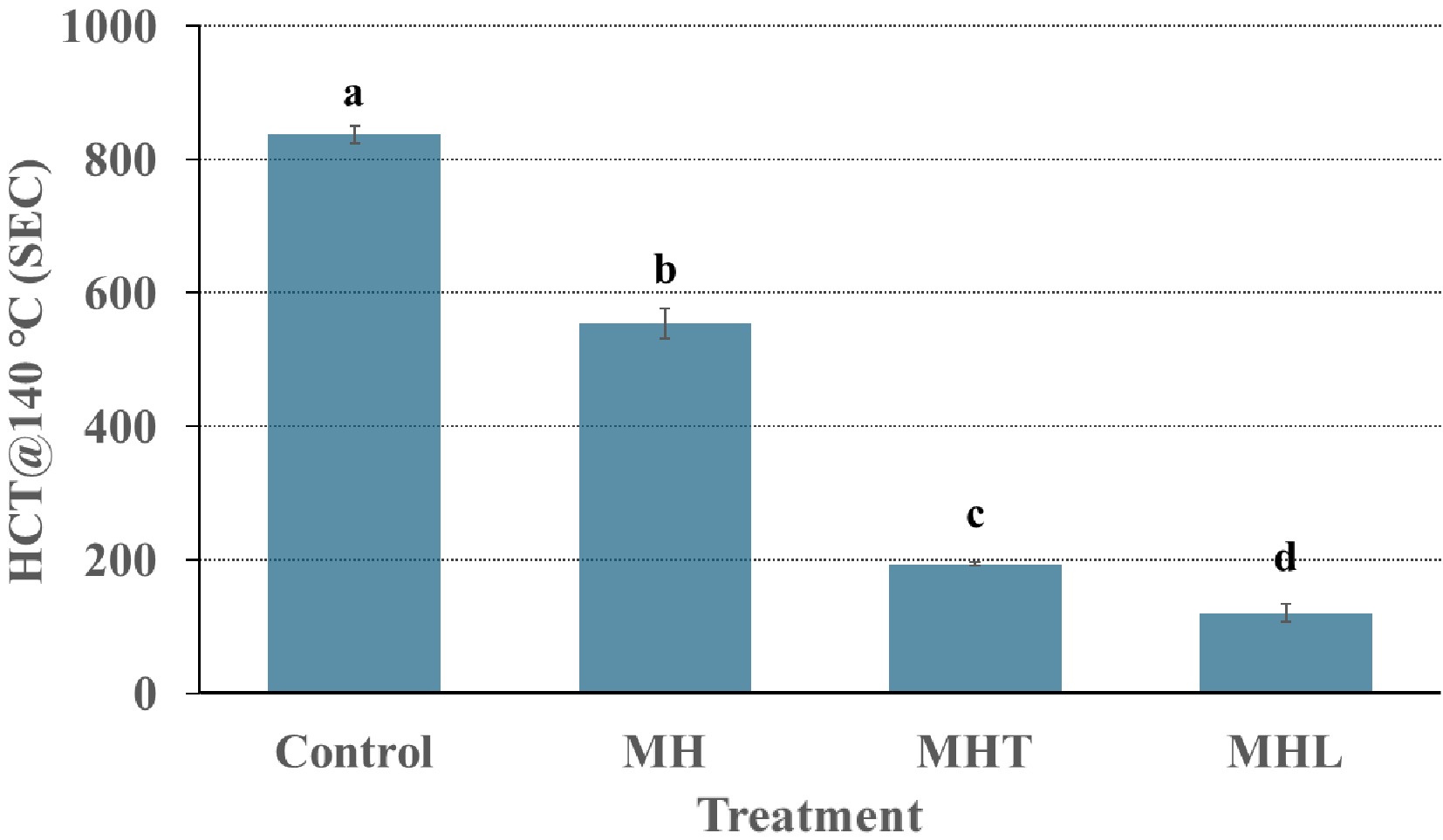 HCT at 140 °C as a function of milk protein concentrate treated with different enzymes: control = without addition enzyme, MH = milk protein hydrolysate, alcalase; MHT = cross-linked milk protein hydrolysate, TGase; MHL = cross-linked milk protein hydrolysate, laccase. Error bars are the standard error of mean for triplicate analysis for triplicate analysis for triplicate analysis for each treatment. a−d Completely different superscript letters between the HCT values on the column bar show significant differences (p < 0.05) between the different enzymes of samples.