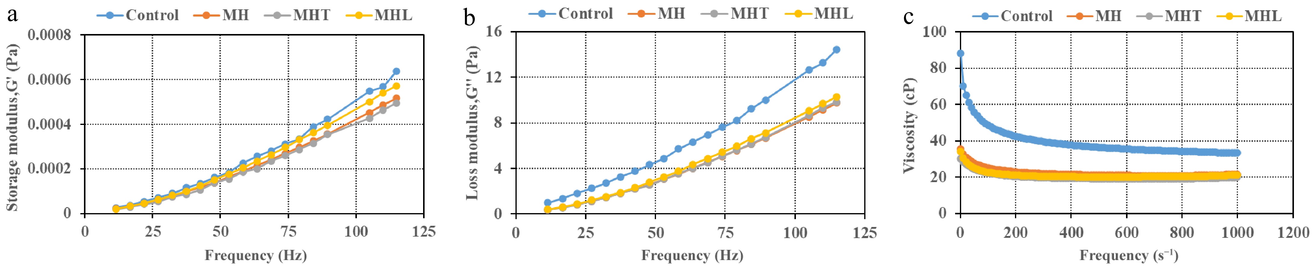 Frequency sweep test. (a) Storage modulus. (b) Loss modulus. (c) Viscosity as a function of MPC treated with different enzymes: control = without addition enzyme; MH = milk protein hydrolysate, alcalase; MHT = cross-linked milk protein hydrolysate, TGase; MHL = cross-linked milk protein hydrolysate, laccase. Error bars for the standard error of the mean (n = 3) are not displayed for the better visual of the graph.