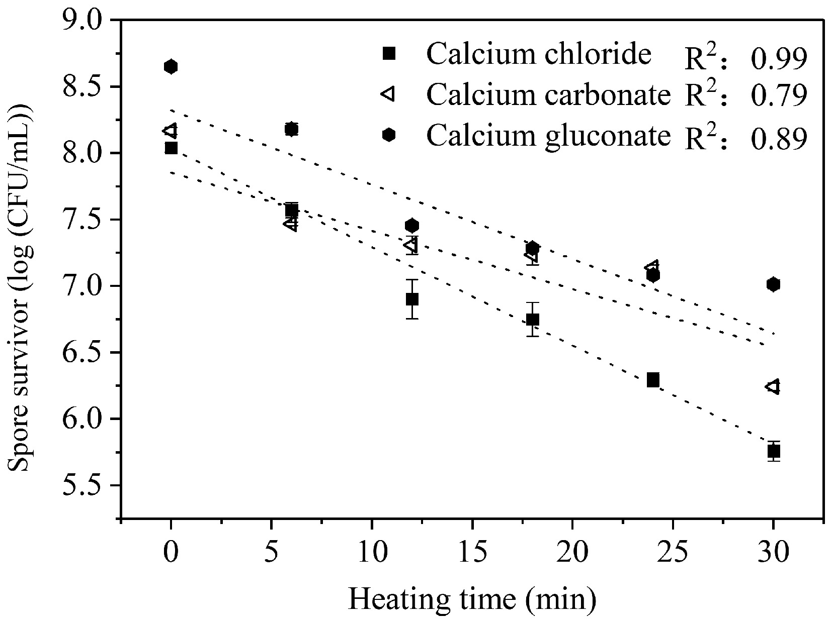 Many factors can affect the spore heat resistance during sporulation, such as temperature and calcium salt addition[46]. Studies have shown that Bacillus subtilis spores formed at higher sporulation temperatures exhibit higher heat resistance, possibly due to dramatic changes in the spore coat assembled under elevated temperatures[7]. For the heat resistance of C. sporogenes spores, reported studies are mainly focused on thermal processing environment and thermal processing techniques[811], the influence of sporulation conditions on spore heat resistance is limited. Studies have shown that the addition of calcium salts is a key measure for regulating spore heat resistance. Yamazaki et al.[12] found that calcium-depleted B. subtilis spores had significantly lower heat resistance compared to calcium-containing spores; Lee et al.[13] compared the effects of different metal ions (Mg2+, Fe2+, Mn2+, Zn2+, and Ca2+) on the heat resistance of Clostridium perfringens spores, and found calcium ions were the most effective in enhancing heat resistance. This is attributed to calcium ions binding with dipicolinic acid (DPA) in the spore to form Ca-DPA chelates, promoting core mineralization and reducing the spore core water content, thereby enhancing spore heat resistance[1416]. However, existing studies primarily focus on the effects of various cations on spore heat resistance[13,16], with limited research on how different calcium salts—especially those with varying water solubility and anions—affect spore heat resistance. In practice, poor solubility of calcium salts in culture media can result in residual undissolved particles, which may interfere with subsequent experiments such as spore purification and microscopic examination. Therefore, identifying calcium salts that effectively supply Ca2+ without disrupting subsequent procedures and exploring their impact on spore heat resistance is of importance for enriching the theoretical understanding of spore heat resistance.