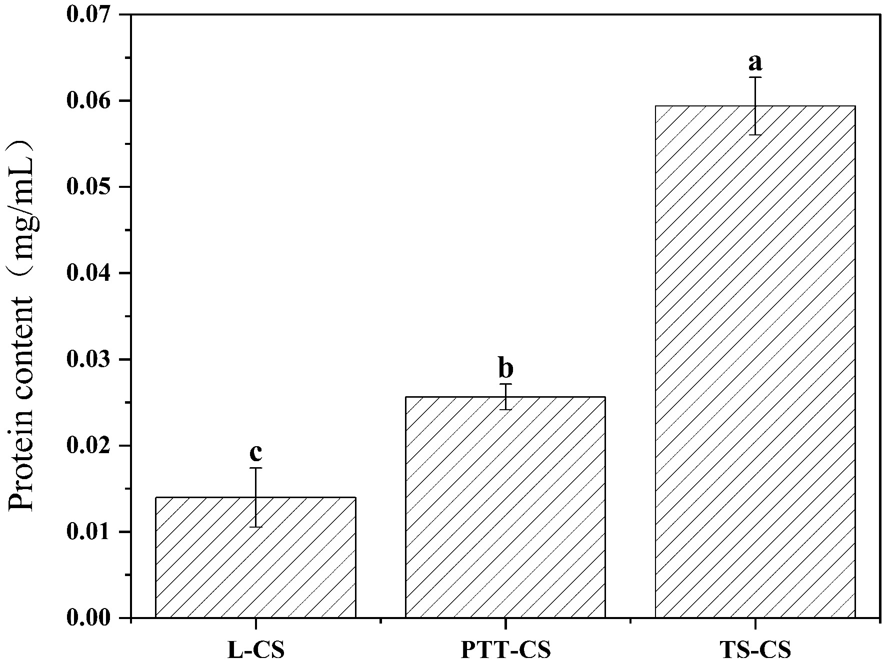 • The coat and cortex are the outer layers of C. sporogenes spores. These two structures are composed of cysteine-rich proteins, while the spore core contains various essential heat-resistant proteins that contribute to thermal stability[28]. As shown in Fig. 2, the protein content of spores formed in the different sporulation media. Among the tested conditions, spores from the TS-CS group exhibited the highest protein concentration (0.059 mg/mL), correlating with the strongest heat resistance (Table 1). Spores from the PTT-CS group ranked second in both protein content and thermal tolerance, whereas the L-CS group showed the lowest protein content and weakest heat resistance. These results are consistent with findings by Malleck et al.[29], who reported that Moorella thermoacetica spores with greater heat resistance had more abundant and diverse proteins in the spore coat. This suggests that the elevated protein content in TS-CS spores may reflect more complete structural assembly and enhanced expression of key heat-resistant proteins during sporulation.