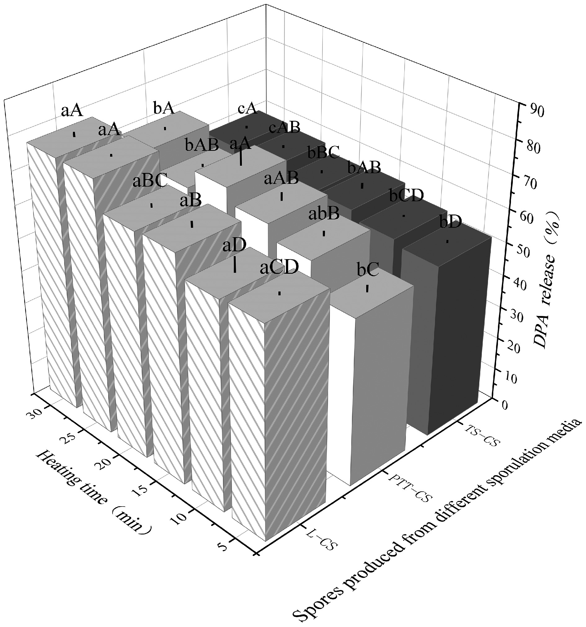 The DPA release of C. sporogenes spores produced by sporulation media with different calcium salts under heating (90 °C). Capital letters indicate significant differences in the DPA release of the same spores under different heating times, and lowercase letters indicate significant differences in the DPA release among different spores under the same heat treatment condition.