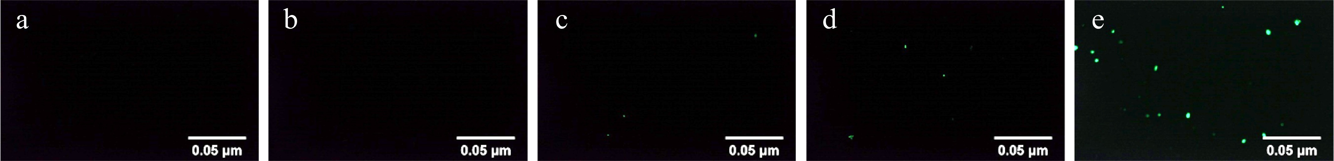 Fluorescence PI staining of C. sporogenes spores under different lysozyme concentrations. (a) Lysozyme concentration was 0.2 μg/mL. (b) Lysozyme concentration was 0.6 μg/mL. (c) Lysozyme concentration of 1 μg/mL. (d) Lysozyme concentration was 1.4 μg/mL. (e) The concentration of lysozyme was 2 μg/mL.