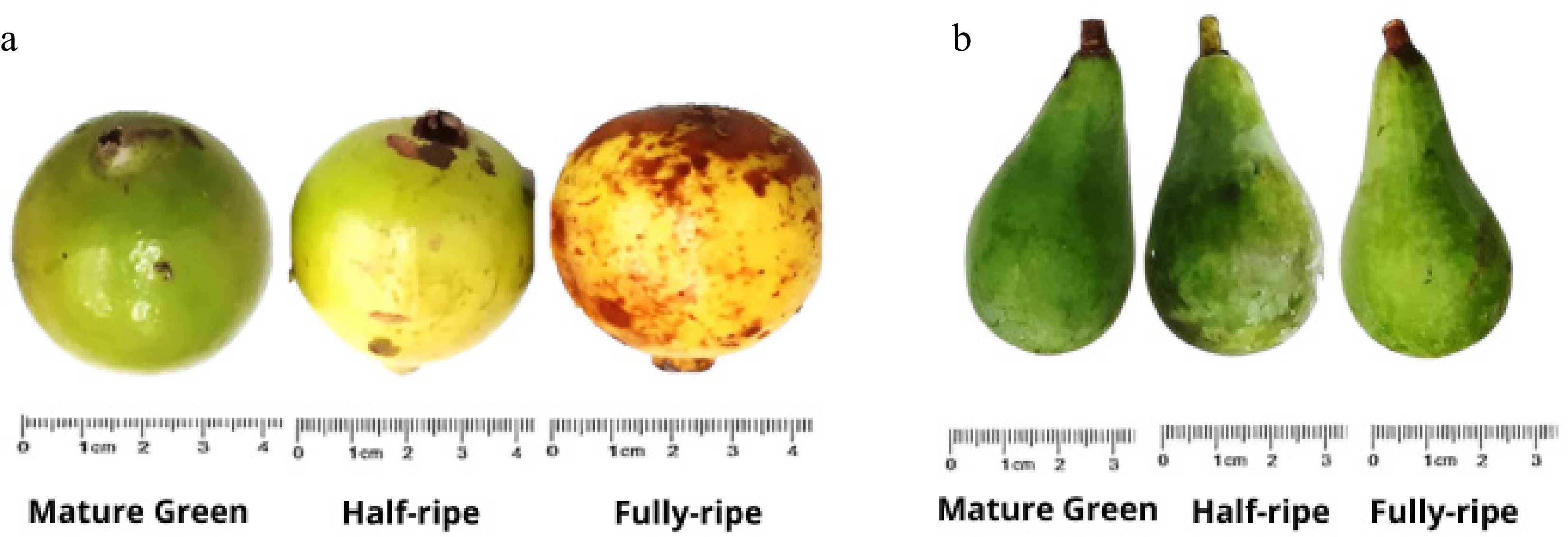 Fruits of (a) marmelada bola (Alibertia edulis) and (b) curriola (Pouteria ramiflora) at different ripening stages (mature green, half-ripe, and fully ripe).