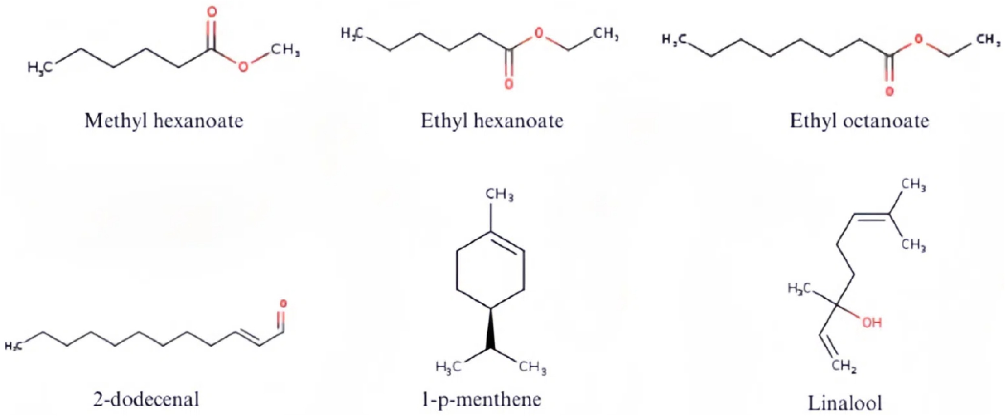 These compounds, associated with sweet, fruity, floral, citrus, or woody notes[31,32], likely define the characteristic aroma profiles of both fruits. However, to confirm their sensory relevance, future studies should incorporate gas chromatography–olfactometry (GC–O) and sensory evaluations[33].