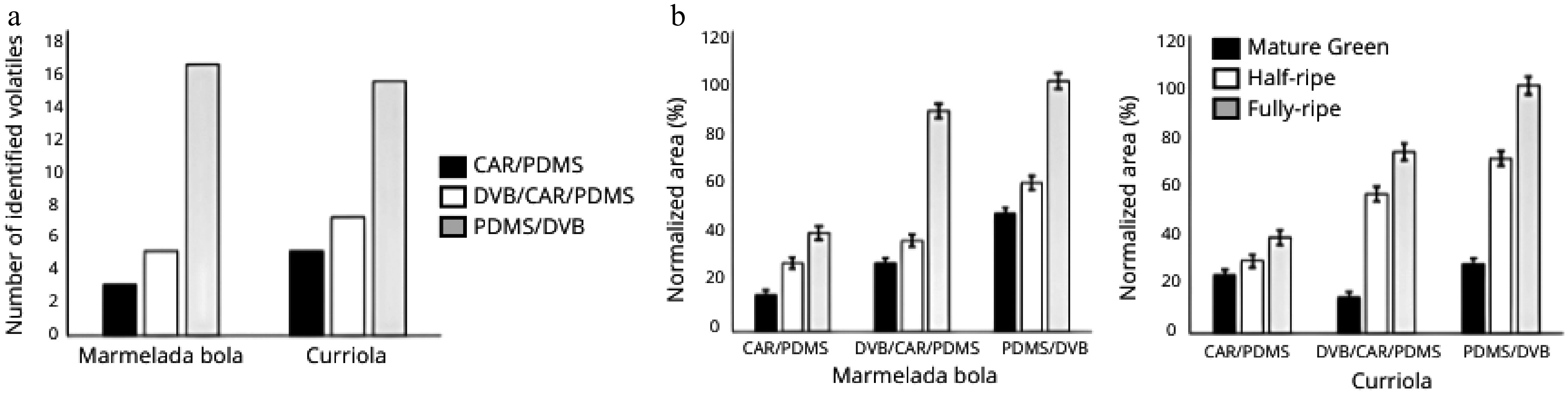 The performance of the SPME fibers used in this study was compared in terms of extraction efficiency, estimated by the number of identifiable compounds in each fruit at the different mature stages, total GC-MS peak area, and repeatability. The sum of the peak areas identified in the total ion chromatogram (TIC) obtained for each SPME fiber was normalized against the sum of peak areas identified in the TIC obtained for the maturity stages. The extraction efficiency was calculated for each SPME fiber with marmelada bola (A. edulis) and curriola (P. ramiflora), with the extraction performed in sextuplicate and a repeatability less than 10%.