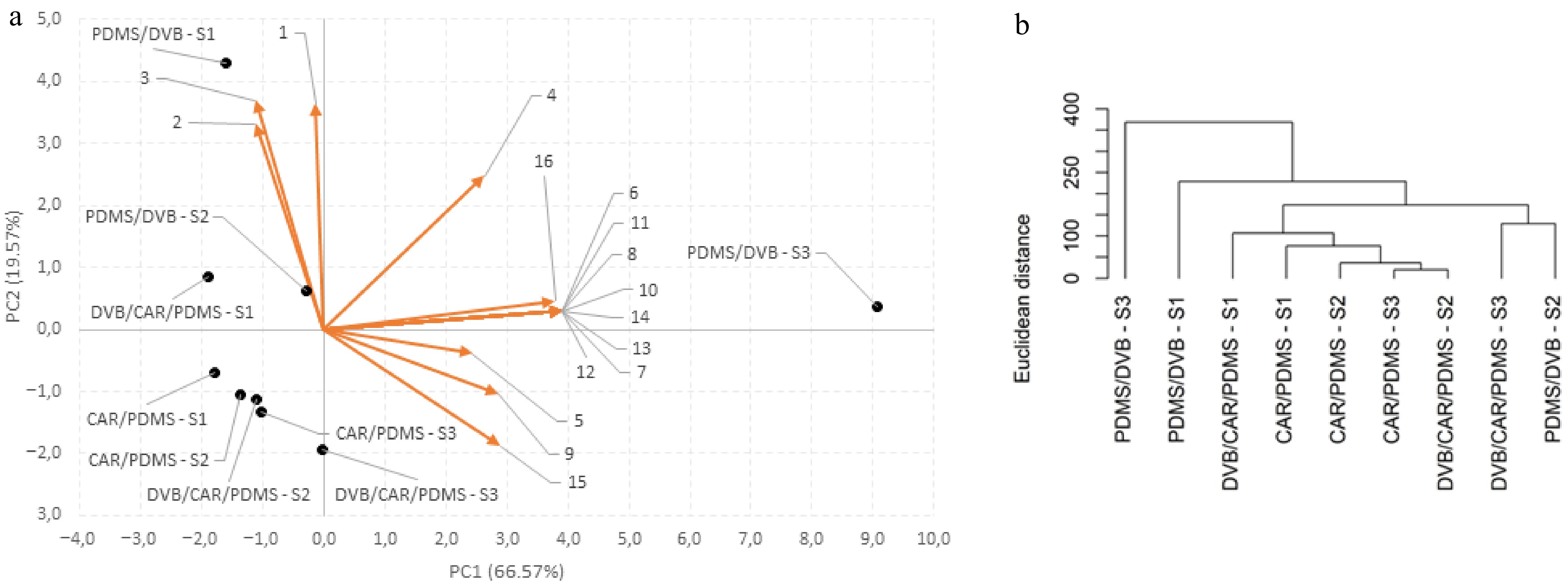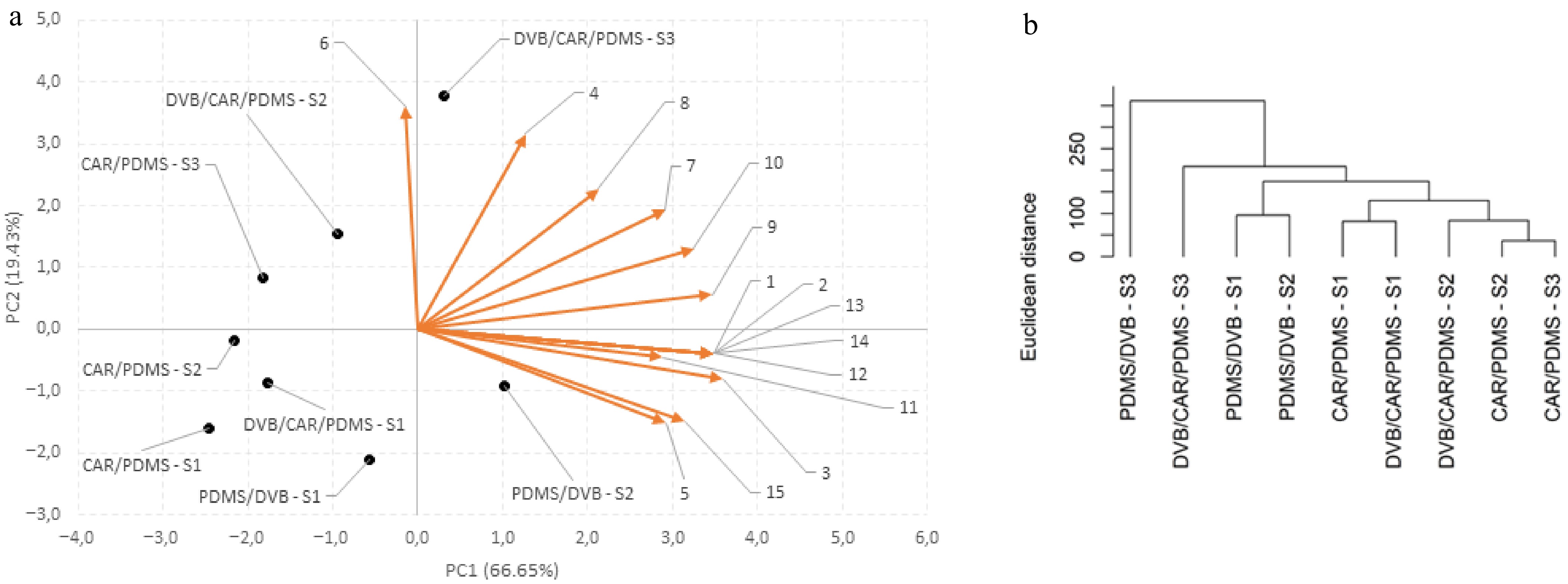 Regarding curriola, it was observed that the first two components (PC1 and PC2) explain 86.080% of the data variation, where PC1 and PC2 represent 66.653% and 19.427% of the total variation, respectively (Fig. 5a & Table 5). Therefore, the variables responsible for the separations in PC1 include the volatile compounds encoded in Table 3 with the numbers 3, 1, 2, 12, 13, 14, 9, 10, 15, 5, 7, and 11, with loadings of 0.970, 0.939, 0.939, 0.939, 0.939, 0.939, 0.935, 0.875, 0.849, 0.788, 0.786, and 0.779, respectively. In the case of PC2, Compounds 6, 4, and 8, with loadings equal to 0.973, 0.851, and 0.614, respectively, were responsible for the separations that occurred in this component. In addition, it can be inferred that there is a tendency of the samples to approach and form six groups according to their similarities, which are (i) PDMS/DVB–FR; (ii) DVB/CAR/PDMS–FR; (iii) PDMS/DVB–MG and PDMS/DVB–MG; (iv) CAR/PDMS–MG and DVB/CAR/PDMS–MG; (v) DVB/CAR/PDMS–HM; and (vi) CAR/PDMS–HM and CAR/PDMS–FR.