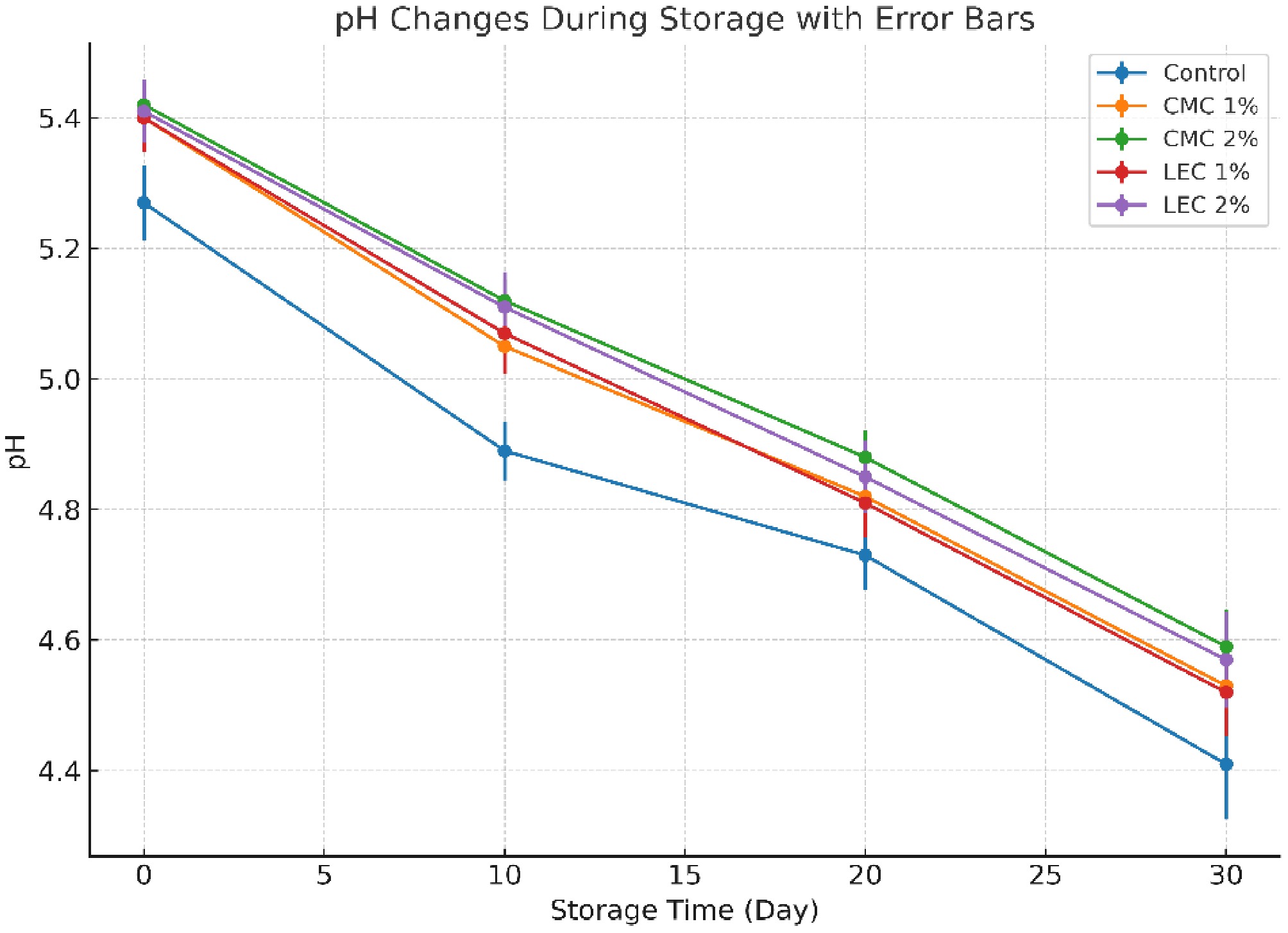 • According to the results regarding the pH changes in the samples (Fig. 1), it was observed that the concentrations of CMC and LEC had a significant effect on the pH of the samples (p < 0.05). Increasing the concentration of CMC up to 2% raised the pH value of the samples. The results showed that the pH of the control sample was slightly lower than that of the cheese samples containing CMC and LEC, and the pH decreased during the 30-d storage period. This decrease can be attributed to bacterial growth or the breakdown of fat, leading to the production of hydroperoxides[23]. Additionally, microbial activity and the breakdown of carbohydrates and sugars during storage result in the production of metabolites such as lactic acid, which lowers the pH over time[24]. Samples with higher concentrations of CMC and LEC exhibited the smallest decrease in pH during storage, likely resulting from their inhibitory effects on bacterial growth. The strong moisture-blocking ability of CMC, which reduces water activity, along with the antimicrobial properties of LEC—attributed to the presence of fatty acids and diglycerides in its structure—may explain this observation[25,26].