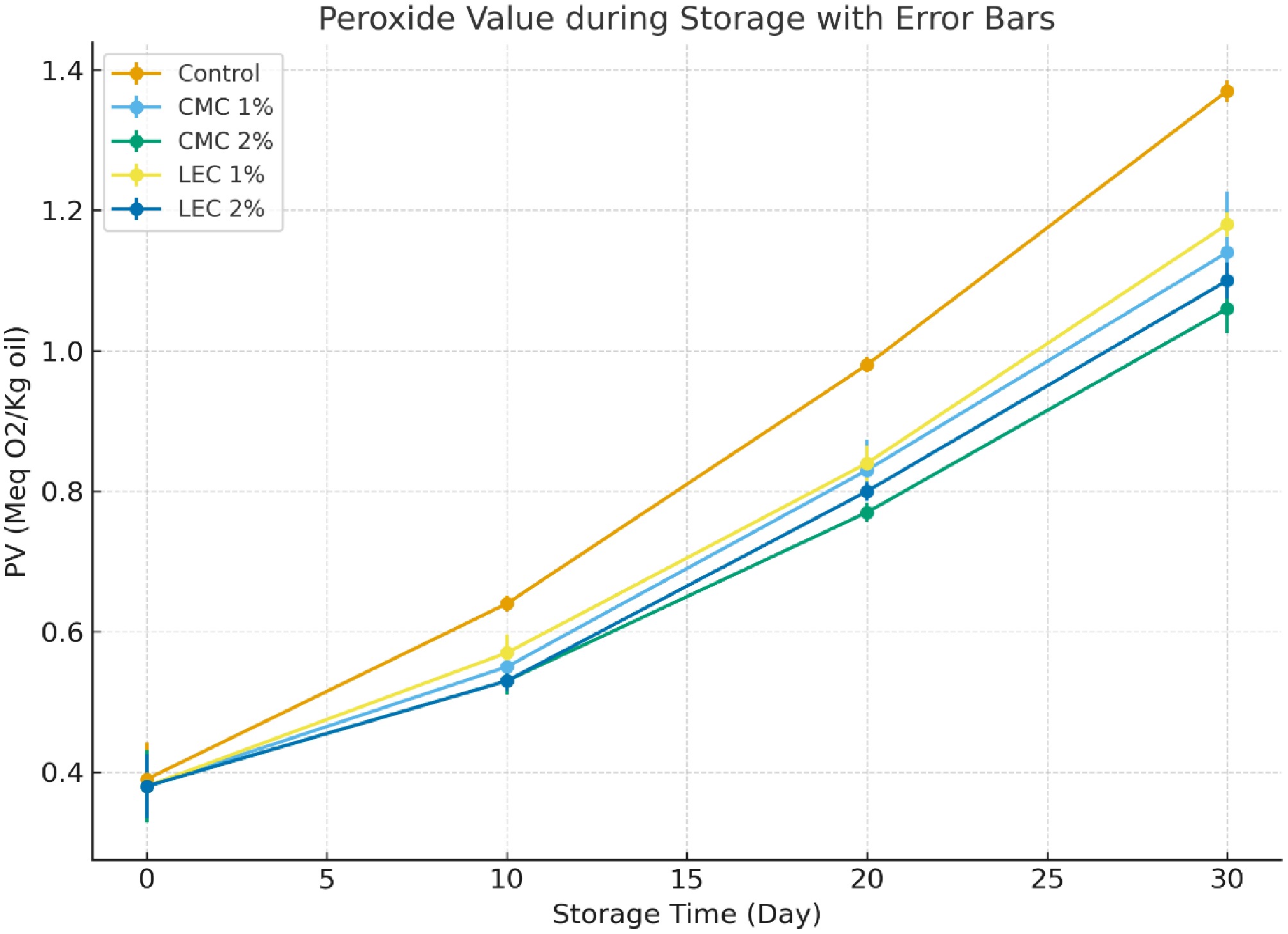 • The peroxide index is a reliable indicator of the oxidation process in oils, fats, and fat-based foods. Peroxides are formed during the initial stage of auto-oxidation and subsequently decompose into free radicals, aldehydes, and ketones, as well as formic and lactic acids[27]. The oxidation of triglycerides can be inhibited by various compounds, which is related to their antioxidant properties[28]. The peroxide values of cheese samples decreased significantly (p < 0.05) with increasing concentrations of CMC and LEC (Fig. 2). This reduction was dose-dependent (p < 0.05). However, during the 30-d storage period, peroxide values showed an increasing trend. In the control sample, the highest peroxide value was observed on the 30th day of storage. The likely mechanism is that the presence of CMC and LEC in the cheese matrix inhibits the formation of hydroperoxides by reducing the auto-oxidation chain reactions. Lecithin forms bonds with fat molecules within the cheese matrix, preventing these compounds from participating in chemical reactions such as auto-oxidation, thereby inhibiting hydroperoxide production[29]. Additionally, various phenolic compounds present in hazelnut oil, such as ferulic acid, naringenin, hydroxybenzoic acid, vanillic acid, catechin, protocatechuic acid, luteolin, and caffeic acid, contribute to the high antioxidant capacity of the cheese formulation[30].