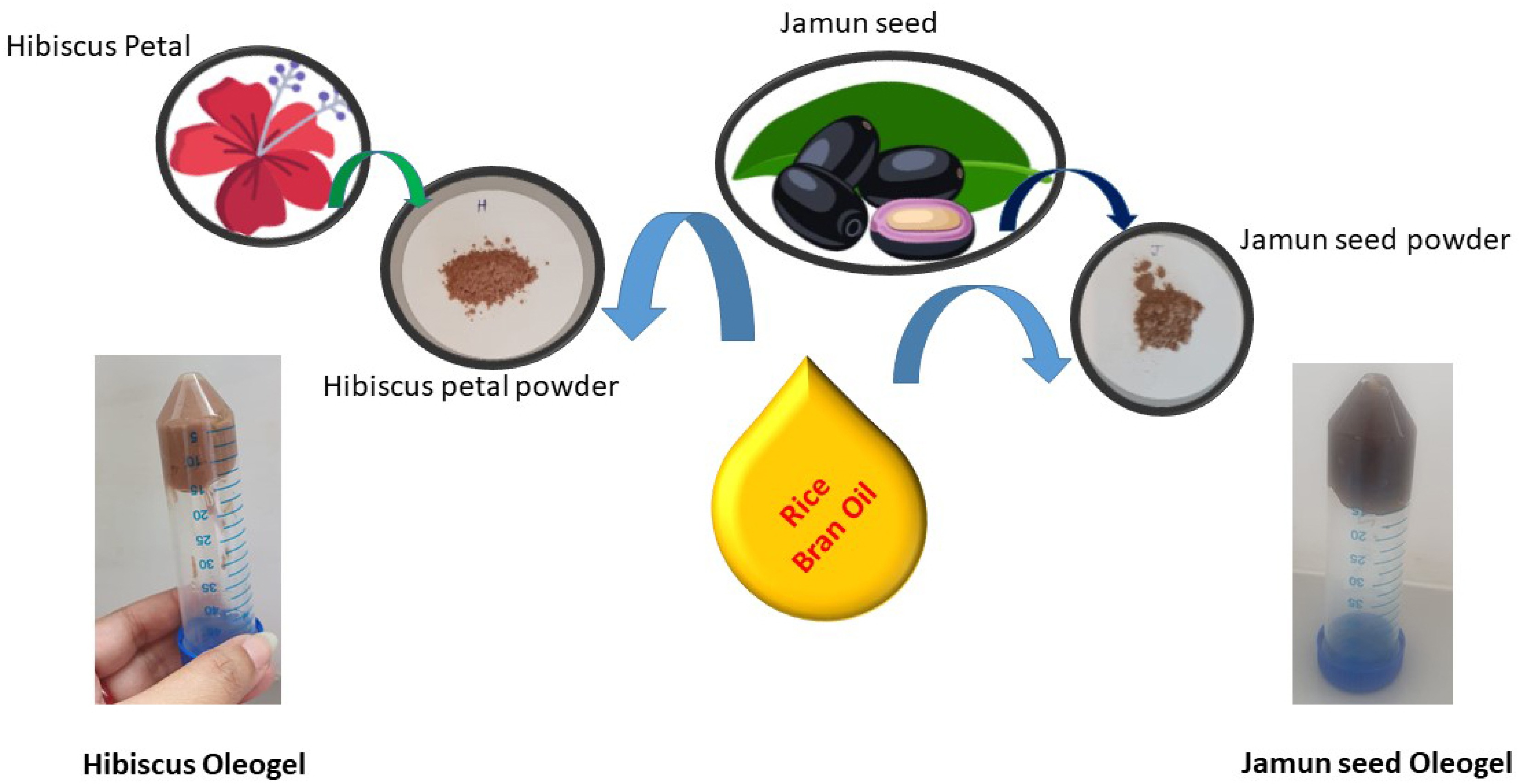 Bigels[1] act as better alternatives to the conventionally used solid fats[2], as conventional saturated fats have been found to be harmful to human health. Bigels are semisolid substances formed by a mixture of an aqueous and an oil phase[3]. They trap liquid oil in a three-dimensional gel matrix-like structure, offering a texture that is very similar to conventional saturated trans fats[4]. Bioactive bigels[4] enhance the texture of a compound, with the additional benefits of drug delivery and antioxidant and antimicrobial properties, and they act as a healthier alternative with high nutritious value. There is an alarmingly increasing demand for ingredients that harmless and also add additional health benefits[5], a criterion which most conventionally used saturated fats fail to fulfill. Bioactive bigels are considered to be a better alternative to conventionally used unhealthy saturated fats[6], as they have significantly reduced saturated fatty acids, enhanced nutritional value, and good oil-binding capacity. Recent efforts to replace saturated fats have explored bigels derived from rice bran wax or beeswax as butter substitutes and fat replacers in bakery products[7]. However, bigels prepared with conventional wax-based oleogelators often exhibit excessive adhesiveness and firmness[8], which may limit consumer acceptance. To overcome these drawbacks, researchers have begun investigating preparation techniques that avoid synthetic emulsifiers or traditional oleogelators by, for example, incorporating nonconventional starches with beeswax[9]. However, studies that completely eliminate conventional wax oleogelators while enhancing functional properties through using bioactive plant sources remain scarce. The present work is the first to report bigels formulated without any conventional wax oleogelators, instead using phytoflavone-rich jamun (Syzygium cumini or S. cumini) seed waste and Hibiscus rosa-sinensis (H. rosa-sinensis) petals to achieve both structural integrity and biofunctional enhancement. Though most previous studies have focused mainly on textural, physical, or baking performance[10], very few have investigated direct butter substitutes for direct consumption (rather than for use in baking[11]) that combine a plant-derived hydrogel such as aloe vera with rice bran oil (RBO) as the continuous oil phase. Our approach therefore provides a novel pathway to develop consumer-acceptable, plant-based bigels with superior antioxidant and antimicrobial functionality, advancing the field of healthy fat replacements. In this research, jamun (S. cumini) seed extract and hibiscus (H. rosa-sinensis) flower petal powder extracts were used[12]. Jamun[13] is known for its antimicrobial, antioxidant, anti-inflammatory properties; hibiscus is rich in antioxidants and is beneficial to the cardiovascular system. These biological extracts improve the stability, texture, smell, and taste of bigels[8], thus reducing the requirement for an artificial extract that causes harmful effects on the human body following its consumption[12]. In food formulations, bigels are becoming more and more popular as healthy substitutes for trans and saturated fats[14]. Gel stability and performance are influenced by structural characteristics. Jamun[15] and hibiscus were chosen because of their antimicrobial and antioxidant properties. Rice bran oil is used because of the presence of oryzanol, which has strong antioxidant properties[16]. Here, the physical, chemical, and oxidative stability are assessed over time under various environmental and storage circumstances as part of the stability studies. Stability is evaluated using antioxidant studies, which help in assessing ability of bigels to prevent the oxidation of the oils and active ingredients, preserving their physical, chemical and therapeutic properties. Optimizing the formulation techniques for targeted distribution, enhanced shelf life[17], and functional performance requires an understanding of stability over various gel dimensions. Antimicrobial studies were done to ensure that the bigel can resist contamination by microbes during storage, which ultimately enhances shelf life and user safety[18]. Evaluating its ability to scavenge free radicals and to inhibit common microbial pathogens aids in assessing their multifunctional capability to be used as an alternative in the food, pharmaceutical, biomedical, and even skin care industries[19]. Bioactive bigels[20] retain the properties of solid fats while being an unsaturated plant oil, thereby offering health benefits[21]. Incorporating these bioactive bigels may enhance their ability to act as a fat replacement for daily use[22]. Their structure and properties are influenced by both intrinsic and extrinsic parameters, and these factors are vital to achieve the desired texture to make it marketable.
