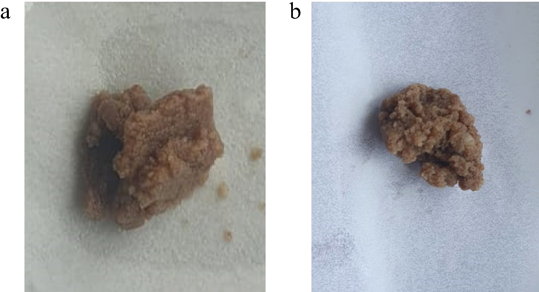 (a) HBg's spreadability is smooth and homogeneous. (b) JBg's spreadability showed coarse granules and it was difficult to spread.
