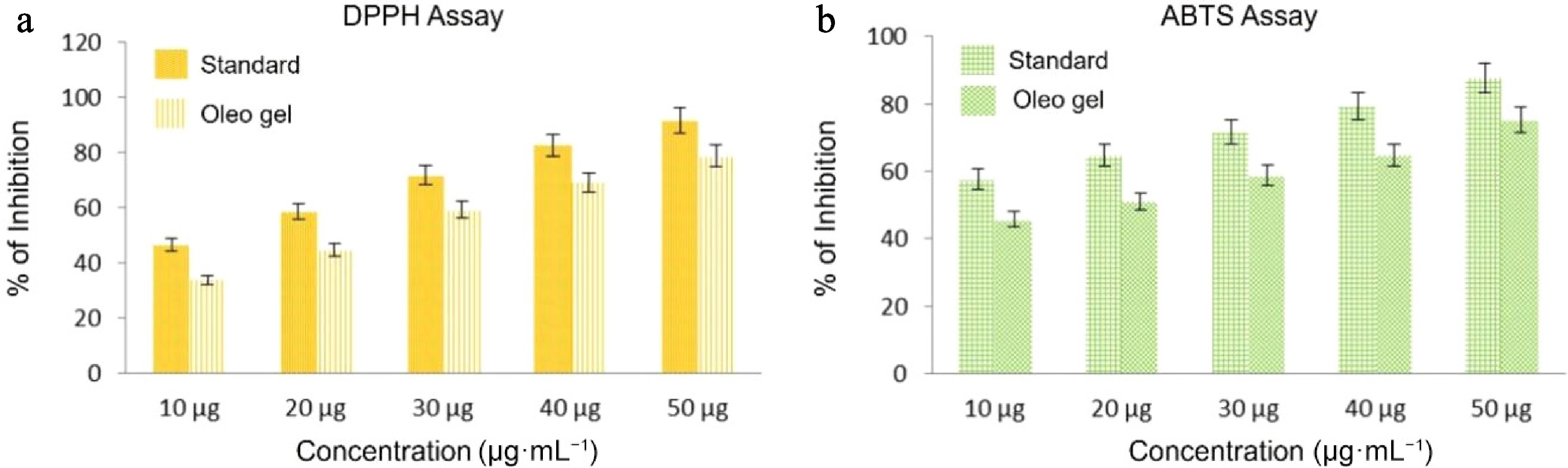 Concentration (µg·mL−1) Standard (%) Bigel (%) 10 57.65 45.71 20 64.81 51.06 30 71.65 58.82 40 79.33 64.69 50 87.61 75.16 There was a similar concentration-dependent rise in inhibition in the ABTS assay data, as shown in the image (Fig. 5b). The inhibition of the HBg was 45.71% at 10 µg·mL−1 and 75.16% at 50 µg·mL−1. With the inhibition approaching that of the standard at higher concentrations, these findings imply that HBg has a potent ability to neutralize ABTS radicals. The finding that hibiscus bigels are strong antioxidants with good efficacy at moderate to high concentrations is supported by the constant pattern of the inhibitory trend from 10 to 50 µg·mL−1. The reported DPPH scavenging activity in the present case is better than that found by Akl et al.[28]. These researchers reported 74.4% scavenging activity for a pumpkin seed oil-based bigel fortified with various extracted canola bioactives which is less than than of our HBg sample, which reported 78.8%. However, in the case of ABTS scavenging activity, their pumpkin seed bigel reported 15% higher efficacy than our HBg[28]. Similar strong antioxidant activities in glyceryl monostearate-based oleogels encapsulated with tea polyphenols were reported by Chen et al.[29]. In their research on a dihydroquercetin and epicatechin-encapsulated diacylgylcerol-based oleogel, Hu et al.[30] observed very strong free radical scavenging activities in DPPH and ABTS assays. Almost 60%–80% efficacy was observed in both cases. HBg outperformed the norm in both tests, demonstrating that it is a dependable alternative. Because of the increased demand for naturally derived antioxidants, this is particularly crucial for applications in fat replacers or fortified consumer products. Another interesting finding was reported by Baltuonytė et al., namely that pure oleogels are more susceptible to oxidation than bigels; i.e., they have more better oxidative stability when the hydrogel is re-enforced with carnauba wax oleogel[31], which aligns with our report, as our bigels are composed of two phases (aloe vera as the aqueous phase and RBO as the oil phase).