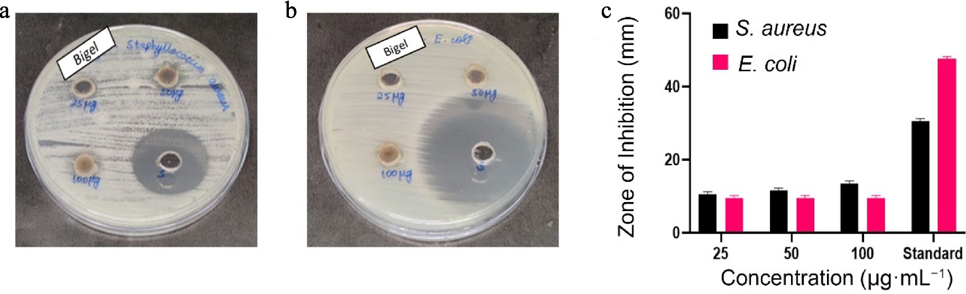 (a) Zone of inhibition in S. aureus. (b) Zone of inhibition in E. coli. (c) Bar graph showing different zones of inhibition at different concentration of HBg.