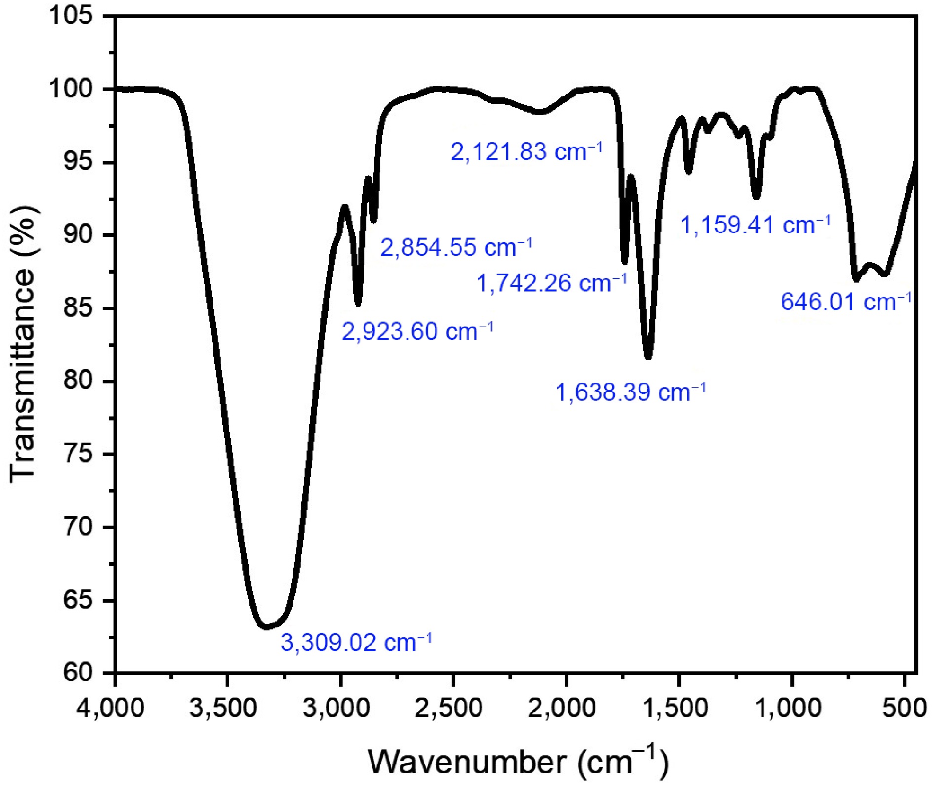 The C=O stretching vibrations that created the strong band at 1,742.26 cm−1 were probably caused by ester or carboxylic acid groups that were present in both the base oil and the plant components. A noticeable peak at 1,638.39 cm−1, which is associated with aromatic rings spanning C=C, also supports the existence of polyphenolic compounds. The C–O stretching vibrations of ethers or esters were also linked to the band at 1,159.41 cm−1, whereas the out-of-plane bending of aromatic C–H bonds may be connected to the peak at 646.01 cm−1. Compared with individual components, the presence of these functional groups and the observed alterations in band locations indicates that the bioactive chemicals were successfully incorporated into the bigel system.