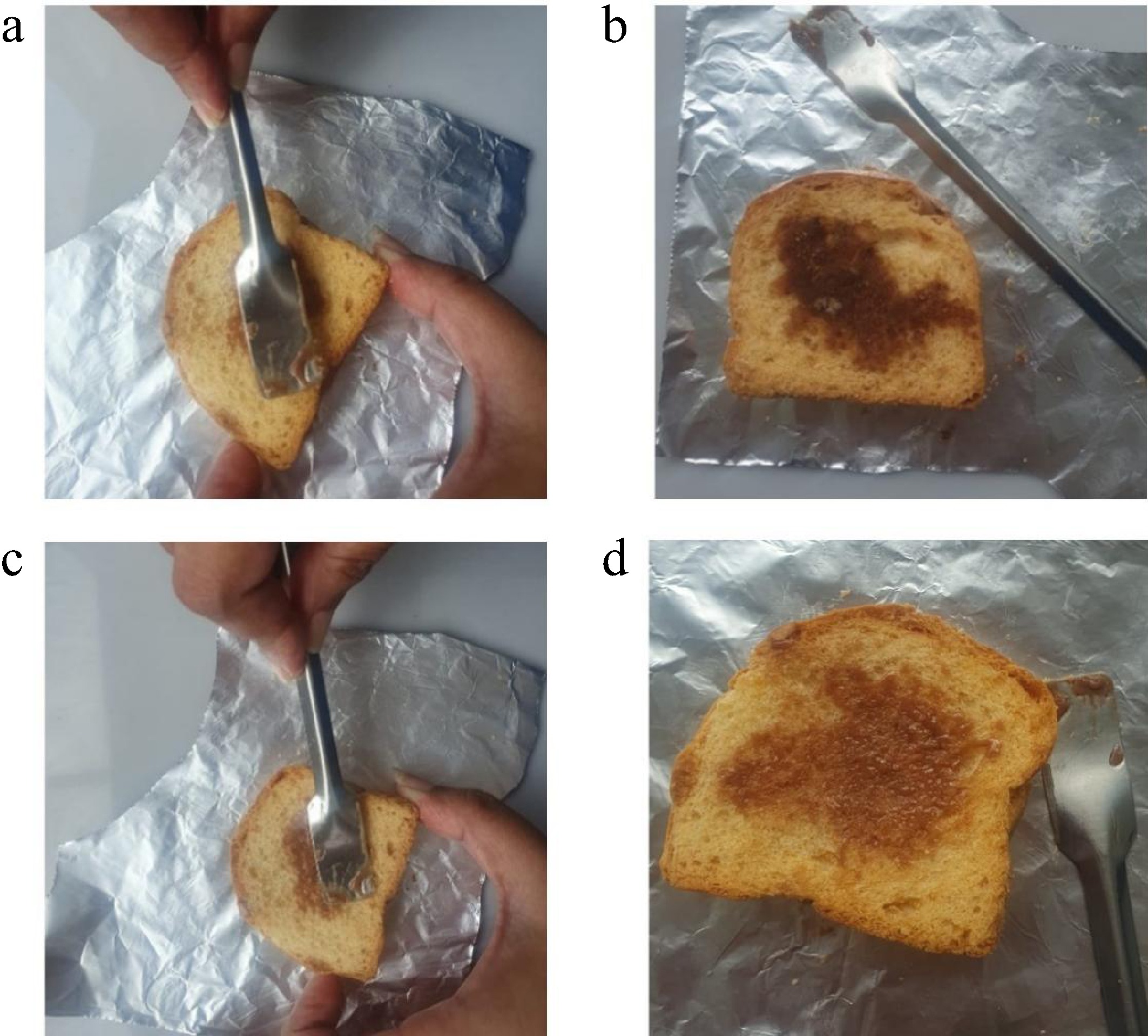 (a) Application of JBg to a toast slice. ( b) The look of the toast after spreading JBg. (c) Application of HBg to a toast slice. (d) The look of the toast after spreading HBg.