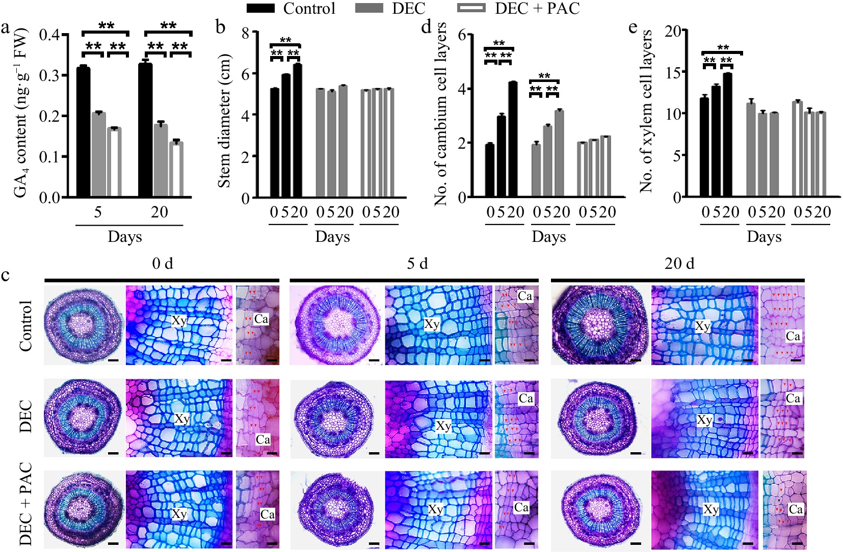 • Gibberellins (GAs) translocated from the shoot apex and leaves have been demonstrated to play a crucial role in stem growth[11,23,24]. To determine whether GAs are locally synthesized in stem tissues, we developed a cultivation system using decapitated poplar plants, which lacked the shoot apex and leaves, thereby eliminating any translocated GAs. Quantitative assays revealed that the endogenous levels of bioactive GA4 in poplar stems were significantly reduced 5 and 20 d after decapitation (DEC) compared to the undecapitated control (Fig. 1a). When paclobutrazol (PAC), a chemical inhibitor that interferes with the conversion of kaurene to kaurenol during GA biosynthesis, was applied to the decapitated plants, GA accumulation in the stems was further diminished due to the removal of the source of bioactive GAs from the shoot apex and leaves (Fig. 1a). Furthermore, the stem diameter of control plants increased as the plants grew, whereas the increase in stem diameter was almost completely inhibited in the decapitated plants treated with PAC (Fig. 1b).