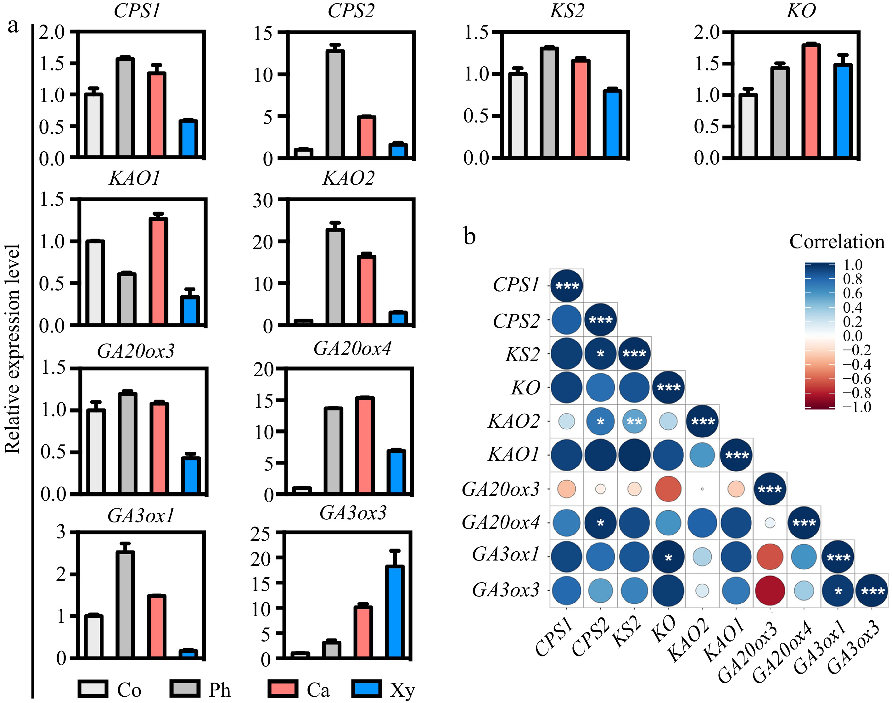 Expression patterns and correlation analysis of GA biosynthetic genes across wood-forming tissues in poplar stem. (a) The expression patterns of GA biosynthetic genes, including CPS1/2, KS2, KO, KAO1/2, GA20ox3/4, and GA3ox1/3, in various tissues of the poplar stem were assessed using micro-sections obtained through freezing microtome. The relative expression levels of each gene in the stem tissues were normalized to 1. Co = cortex; Ph = phloem; Ca = cambium; Xy = xylem. (b) Correlation analyses of the expression levels of GA biosynthetic genes in stem tissues were performed. Correlations were calculated based on a Student's t-distribution (degrees of freedom = n − 2, two-tailed test). Statistical significance is indicated as follows: *, p < 0.05; **, p < 0.01; ***, p < 0.001. Heatmaps were generated using RStudio software (R package: ggplot2). Positive correlations are represented by blue, while negative correlations are represented by red. The size of the circle corresponds to the strength of the co-expression correlation.