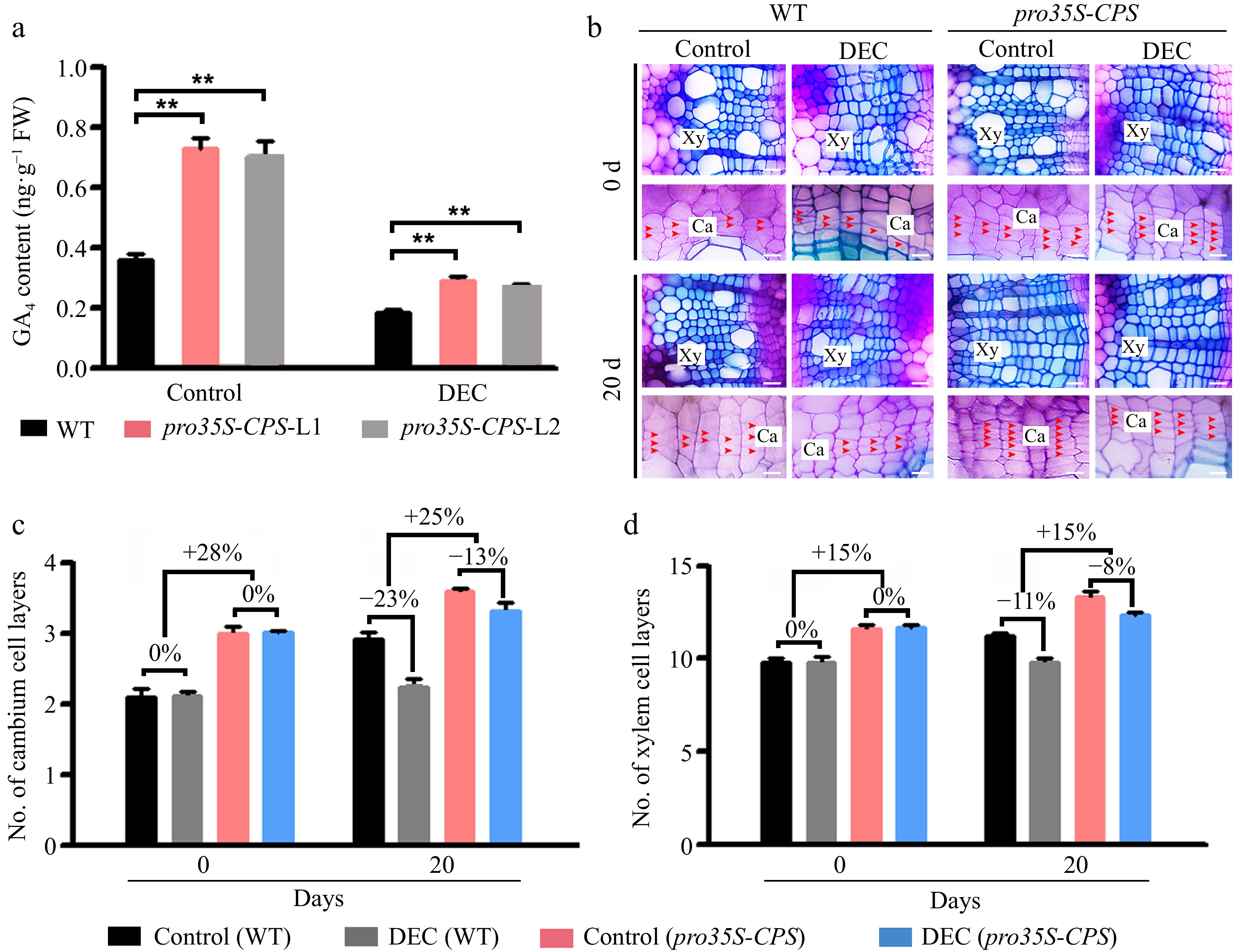 To further assess the impact of local GA biosynthesis on vascular tissues, the pro35S-CPS lines were decapitated and stained with toluidine blue (Fig. 3b). Overexpression of CPS significantly enhanced cambium and xylem development compared to WT (Fig. 3b), although the effect on vascular development was reduced by decapitation (Fig. 3b). Quantitative analysis revealed a 13% and 23% reduction in the number of cambium cell layers in pro35S-CPS and WT plants, respectively, 20 days after decapitation (Fig. 3c). In contrast, the number of xylem cell layers was only slightly reduced in pro35S-CPS plants following decapitation compared to WT (Fig. 3d). These findings suggest that locally synthesized GAs play a role in regulating secondary vascular development in poplar stems.