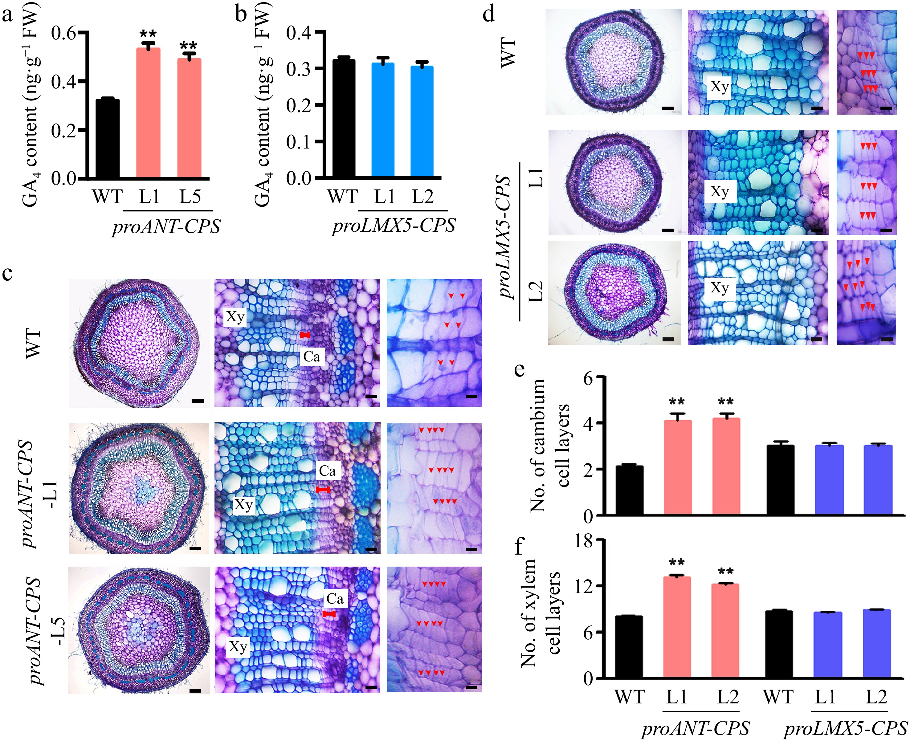 • Given that GAs can be locally synthesized de novo in poplar stems, we aimed to identify the specific sites of GA biosynthesis that regulate wood development. To investigate this, we expressed the CPS genes in Populus tomentosa under the control of the cambium-specific ANT promoter[26] and the xylem-specific LMX5 promoter[15]. Several transgenic plants harboring the proANT-CPS and proLMX5-CPS constructs were generated, and two representative lines with high expression of each transgene were selected for further analysis (Supplementary Fig. S7). Notably, GA4 accumulation was significantly increased in the proANT-CPS transgenic plants compared to WT plants (Fig. 4a), whereas no significant changes in GA4 levels were observed in the proLMX5-CPS transgenic plants (Fig. 4b). Cross-sections of the 5th internode revealed that overexpression of CPS in the cambium zone of proANT-CPS plants enhanced both cambium and xylem development (Fig. 4c). The number of cambium and xylem cell layers was significantly greater in the proANT-CPS lines than in WT plants (Fig. 4e & f). In contrast, no significant changes in cambium and xylem development were observed in the proLMX5-CPS lines (Fig. 4df).