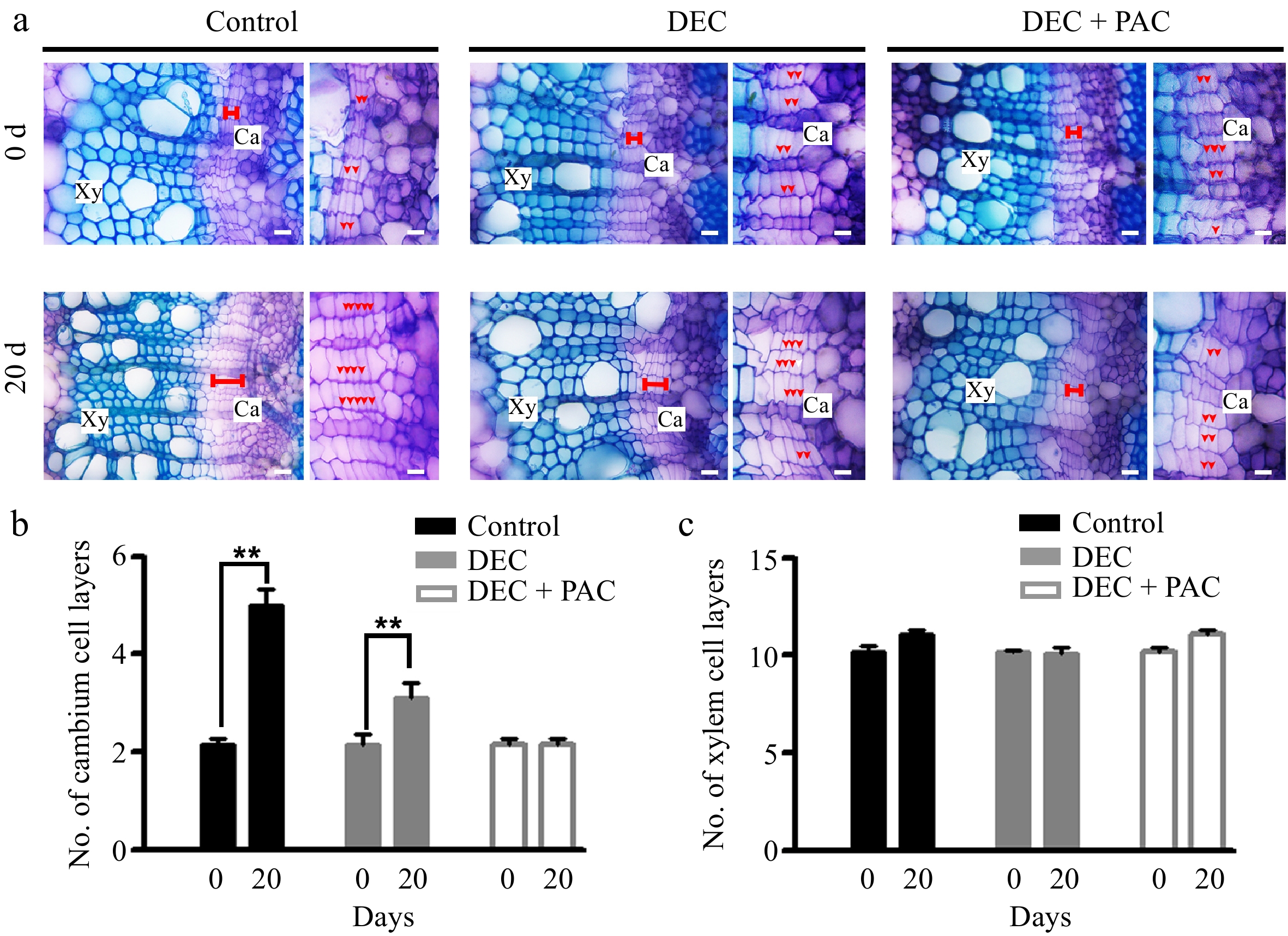 Locally biosynthesized GAs positively regulated cambial division in proANT-CPS transgenic poplar. (a) Cross-sectional images and toluidine blue staining of 4-week-old proANT-CPS transgenic lines subjected to decapitation and/or paclobutrazol (PAC) treatments. Transgenic plants were grown in WPM medium for 5 and 20 d under decapitation and 10 μM PAC treatments, respectively. Red dots indicate cambium cell layers. Scale bars = 50 μm. (b) Quantification of cambium cell layers in the stems of proANT-CPS transgenic lines after decapitation and/or PAC treatments. (c) Quantification of xylem cell layers in the stems of proANT-CPS transgenic lines following decapitation and/or PAC treatments. DEC, decapitation; PAC, 10 μM paclobutrazol. Error bars represent ± SD. Asterisks indicate significant differences in cambium cell layers after 20 d of decapitation treatment (Student's t-test; **, p < 0.01; n = 3).