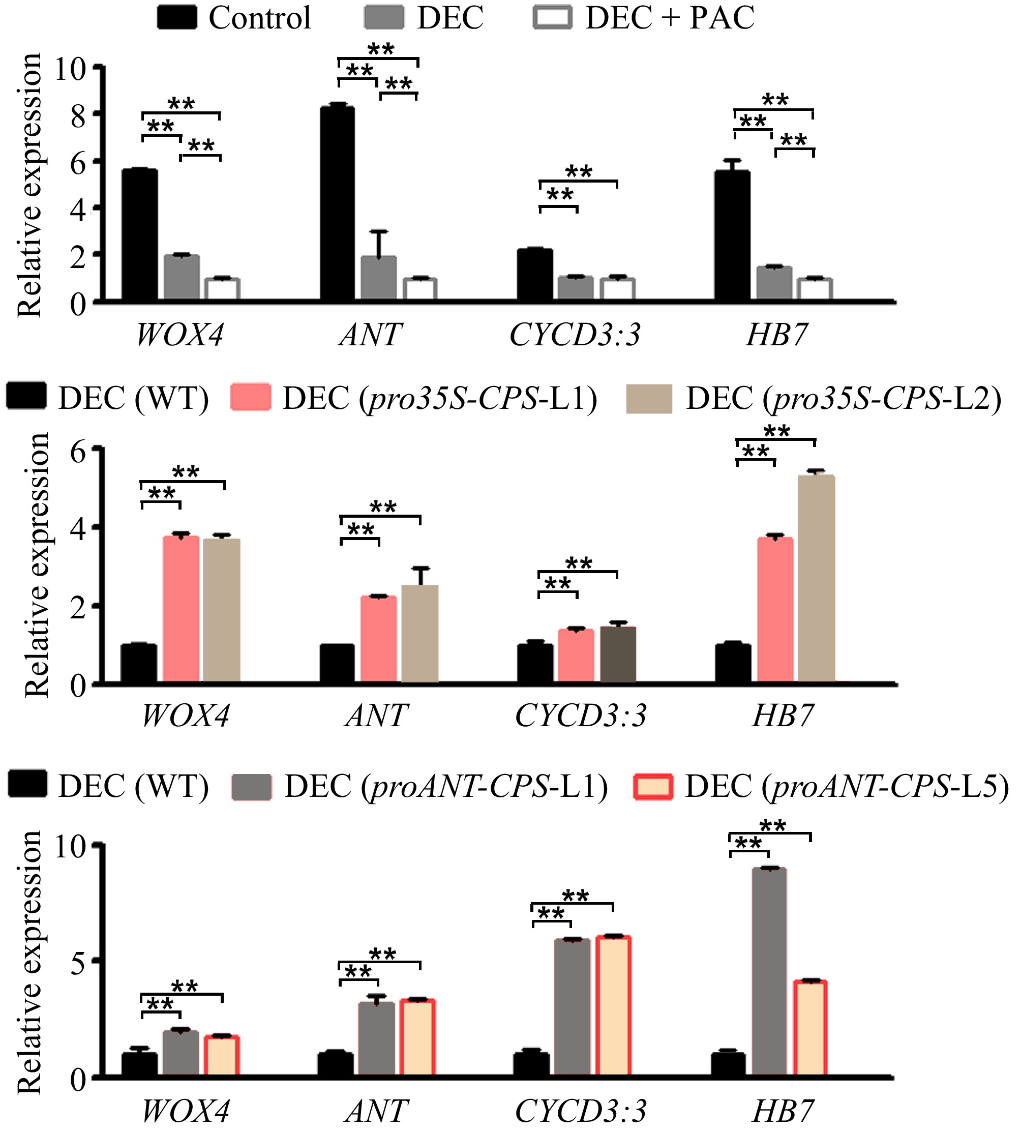 Expression levels of cambium development-related genes responding to local GA biosynthesis in poplar. (a) Relative expression levels of WOX4, ANT, CYCD3:3, and HB7 in wild-type (WT) plants subjected to decapitation and/or PAC treatments. (b) Relative expression levels of WOX4, ANT, CYCD3:3, and HB7 in WT and pro35S:CPS transgenic lines (L1 and L2) following 20 d of decapitation treatment. (c) Relative expression levels of WOX4, ANT, CYCD3:3, and HB7 in WT and proANT:CPS transgenic lines after 20 d of decapitation treatment. Error bars represent the ± standard deviation (SD). Asterisks indicate statistically significant differences in gene expression levels between WT and each transgenic line, as determined by one-way ANOVA followed by Tukey's test for pairwise comparisons (**, p < 0.01; n = 3). DEC, decapitation; PAC, 10 μM paclobutrazol.