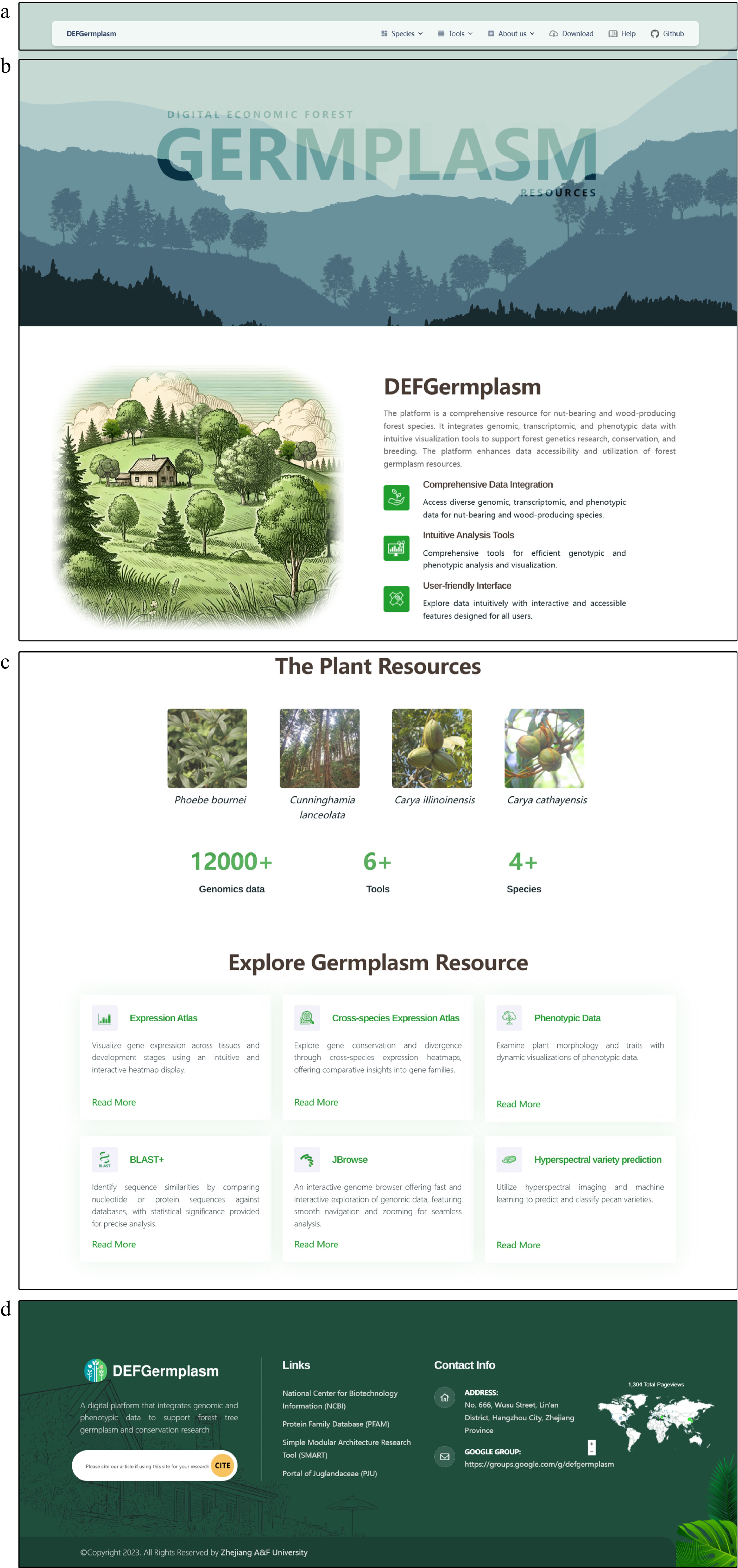 The front page of the Digital Repository for Characteristic Economic Forest Germplasm Resources Platform (DEFGermplasm). (a) The navigation bar offers access to species pages, data downloads, analytical tools, and user help. (b) The homepage features a waterfall effect and silhouettes of species, emphasizing the platform's theme. (c) The main content section displays clickable images of species, offering quick access to their respective pages. This section also summarizes the platform's key datasets and tools. (d) The footer offers links to external analysis sites, website information, contact options, and a plug-in that tracks visitor data.