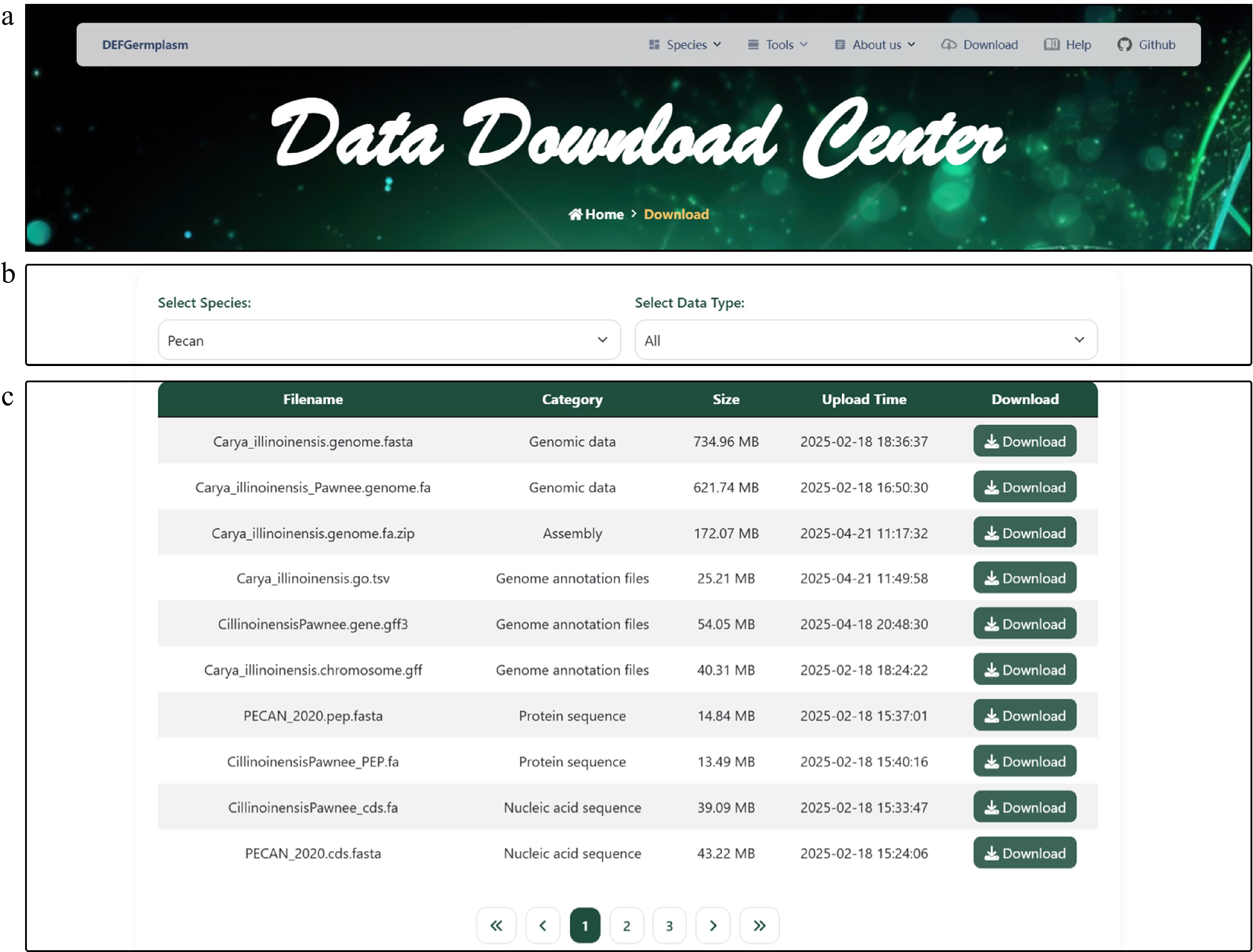 Data Download Center interface. (a) The navigation bar. (b) The data download interface enables users to filter datasets based on specific criteria and download the selected data for further analysis. (c) Presentation of diverse downloadable data for pecan, including genomic, transcriptomic, and phenotypic data.