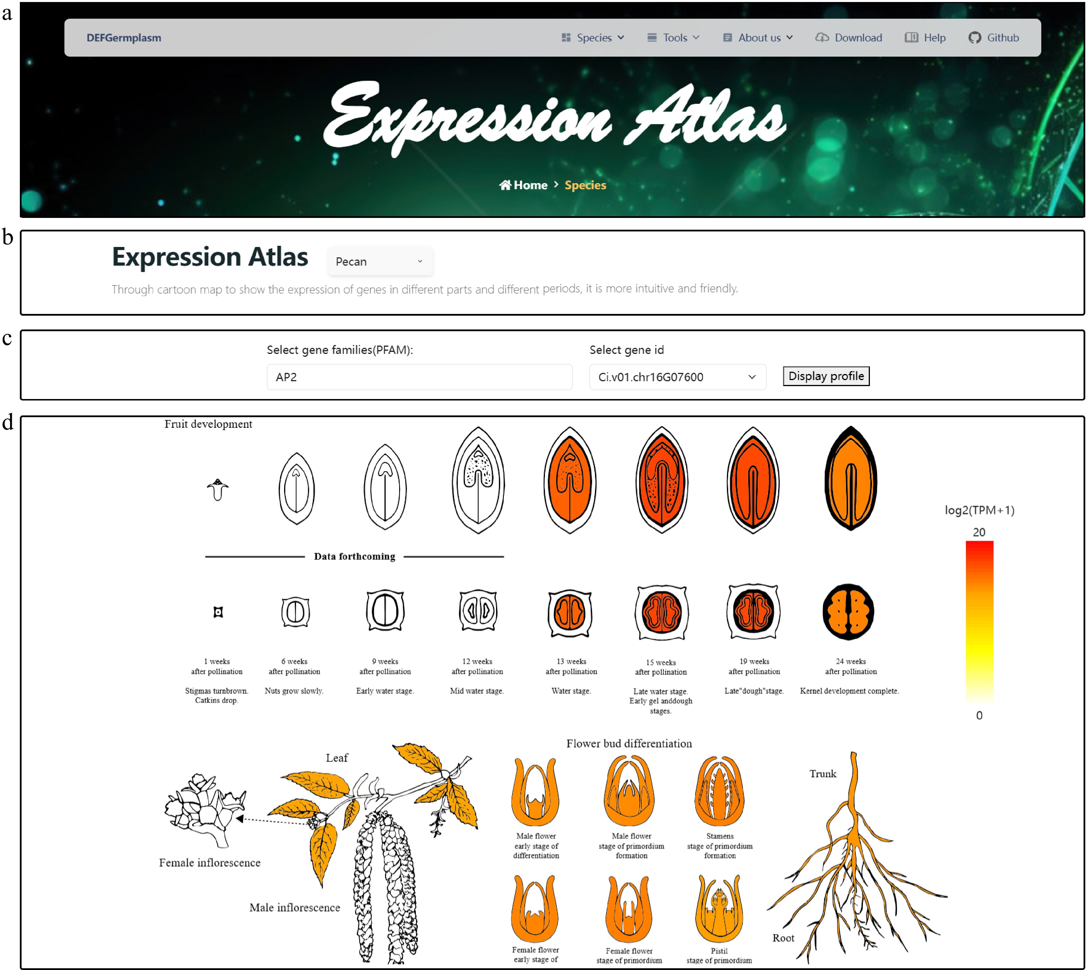 Visualization of the gene expression atlas across different tissues of pecan. (a) Expression atlas logo and navigation bar. (b) Species selection interface for gene family analysis. Users can choose from multiple integrated species, which enables targeted gene family search and comparison. (c) Gene family and gene ID selection interface. Users can select a gene family of interest from a dropdown menu. The platform supports both direct input and fuzzy search to efficiently retrieve specific gene IDs within the selected family. By clicking the 'Display' button, users can generate a tissue-specific gene expression heat map for the selected gene, enabling intuitive visualization of expression patterns. (d) Detailed visualization of gene expression patterns in pecan for gene Ci.v01.chr16G07600, highlighting differences across various tissues. The heat map provides functional insights by illustrating the spatial expression profile of the gene within the plant.