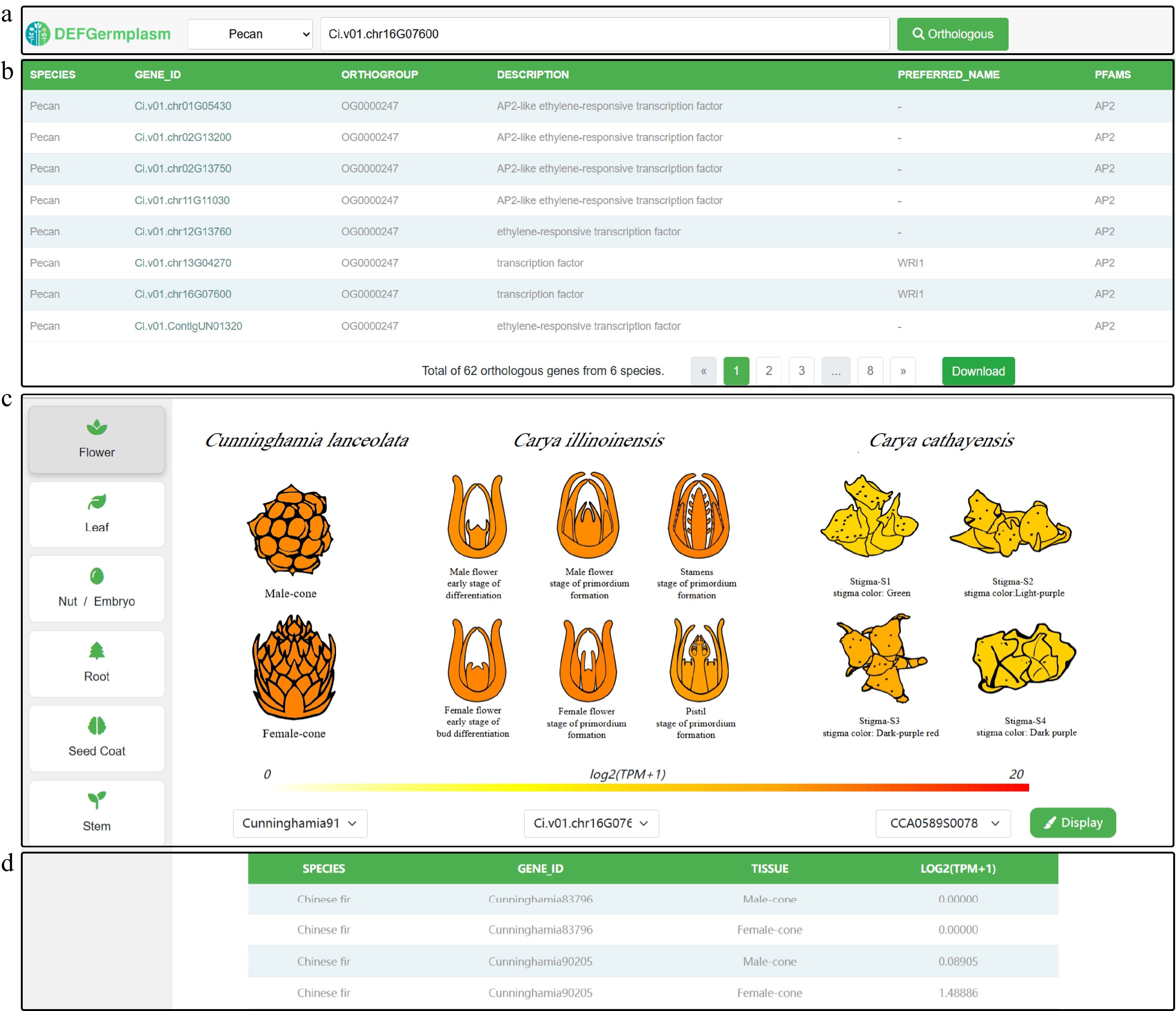 • Intuitive visualization is a hub concept of the DEFGermplasm platform. For example, an expression atlas lets users explore and compare gene expression profiles across pecan, hickory, Chinese fir, and phoebe. This feature provides an intuitive way to examine gene expression patterns across various tissues, highlighting tissue-specific expression characteristics and facilitating cross-species comparisons.