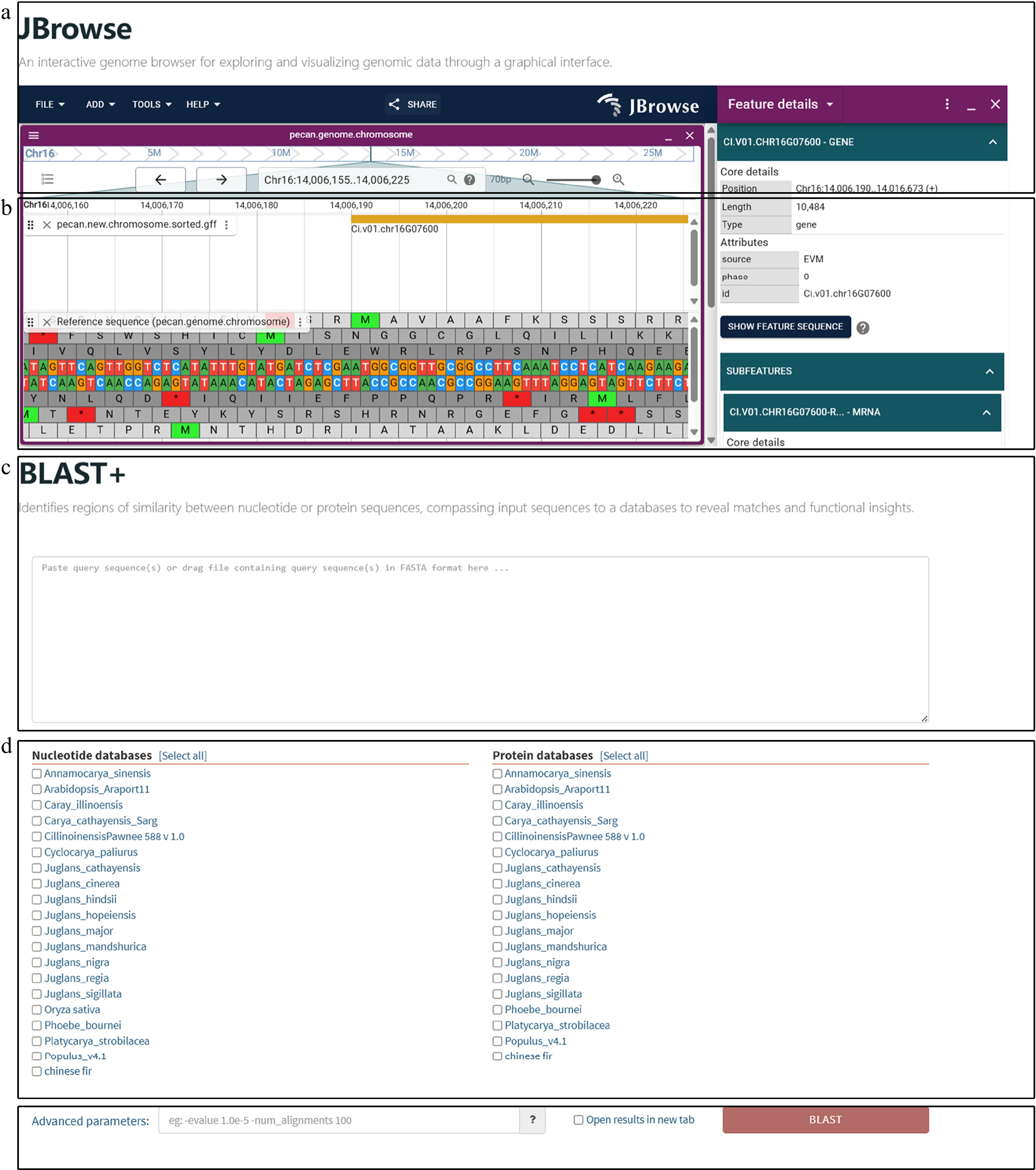 Sequence homology search and interactive visualization of genomic data. (a) Genome browser interface implemented with JBrowse. Users can explore genome structures and annotations through an intuitive graphical interface. (b) Detailed genome view in JBrowse showing gene structures, including exons and introns, along with functional annotations. Users can zoom into specific regions to explore gene features, regulatory elements, and expression data for in-depth genetic analysis. (c) Homology searches are initiated by inputting CDS or PEP sequences through a user-friendly interface that supports both pasting and uploading. Detailed results include alignment scores, match statistics, and sequence similarities. (d) Users can select the desired algorithm (BLASTN or BLASTP) and reference database for comparison. The platform integrates genomic datasets from pecan, hickory, Chinese fir, phoebe, and public databases, enabling multi-species comparisons. (e) Additional parameters, such as e-value thresholds, can be configured to refine search criteria and enhance result precision.